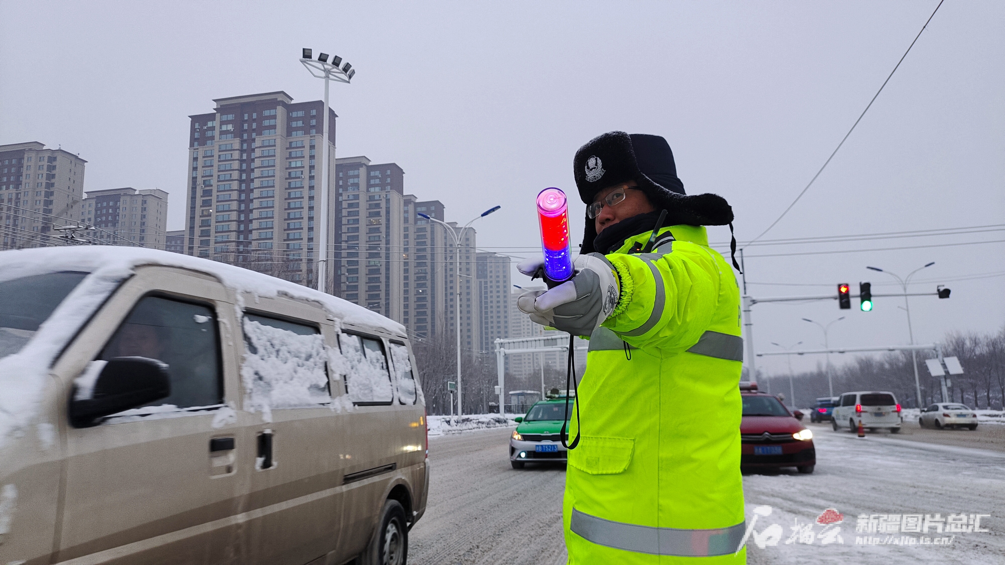 1月9日,乌市交警在雪中指挥交通。欧建亮 摄