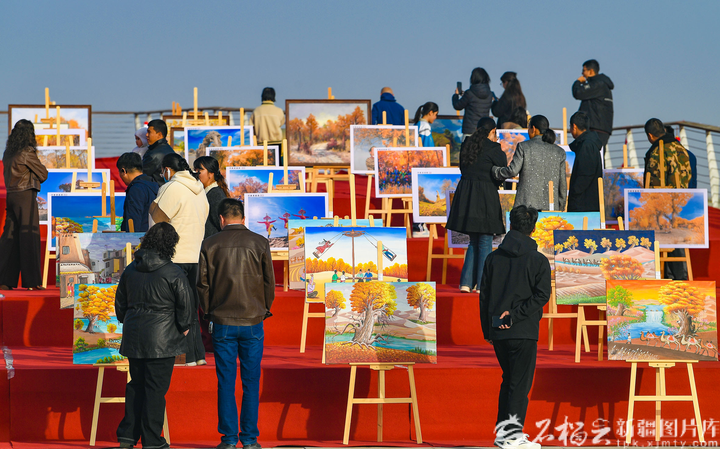 10月25日,游客在第六届新疆喀什丝路文化胡杨节开幕式现场观赏胡杨主题农民画作品。