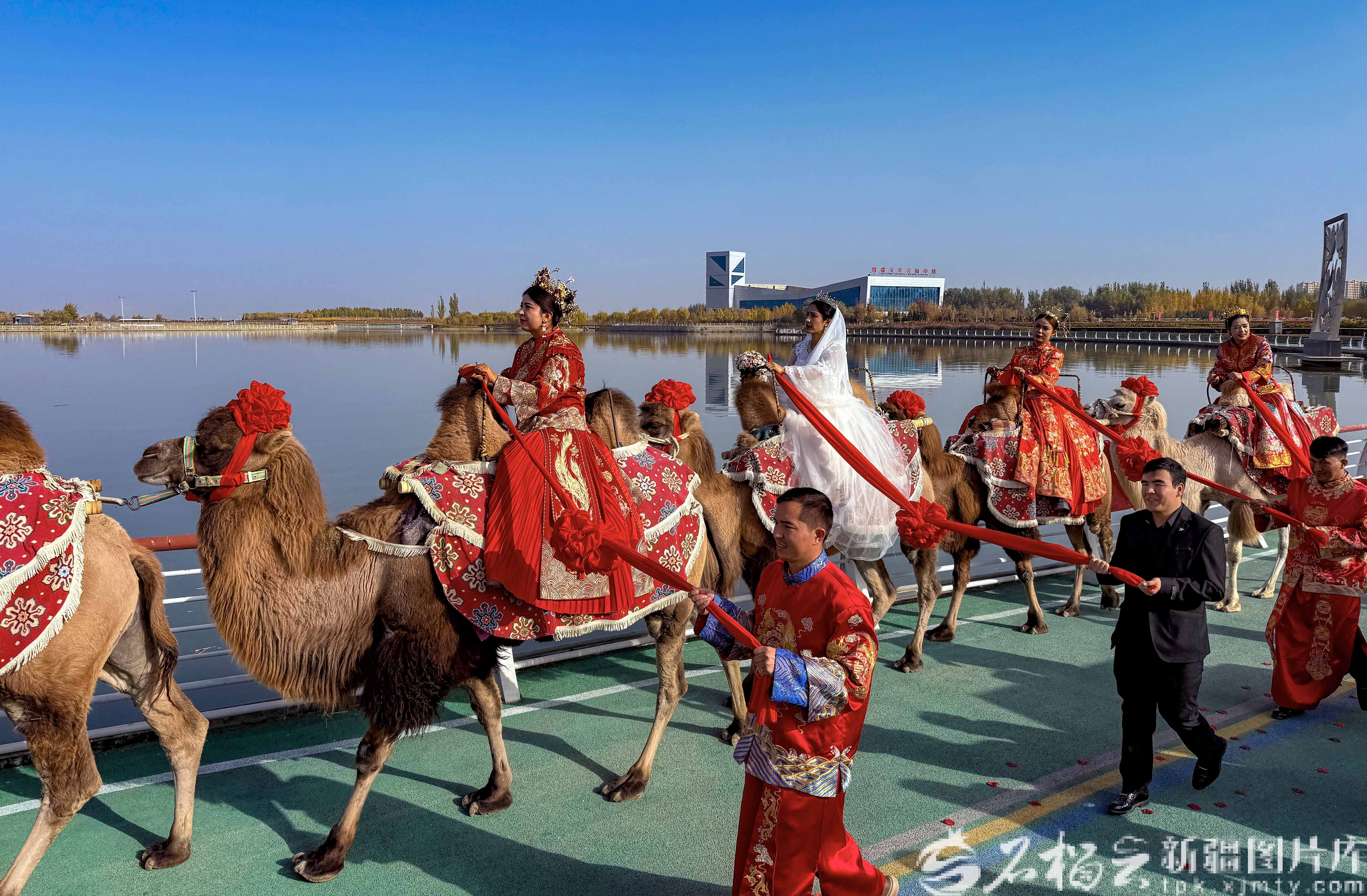 10月25日,在第六届新疆喀什丝路文化胡杨节沙漠胡杨集体婚礼上,新人骑骆驼入场。