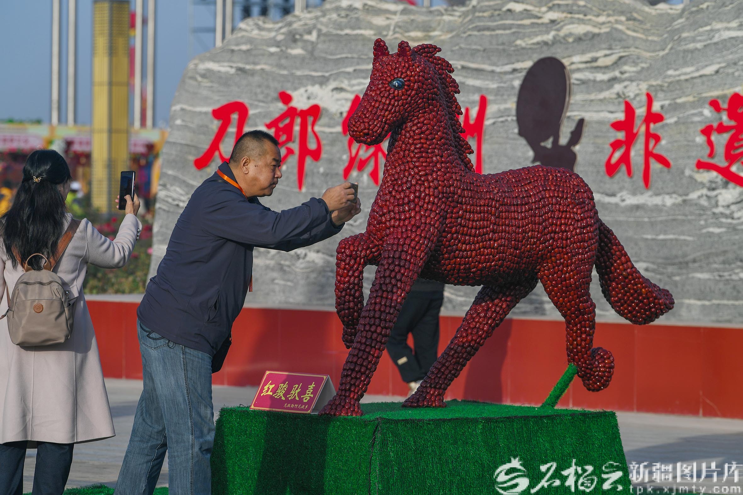 10月25日,在第六届新疆喀什丝路文化胡杨节开幕式现场,游客拍摄用红枣制作的骏马。