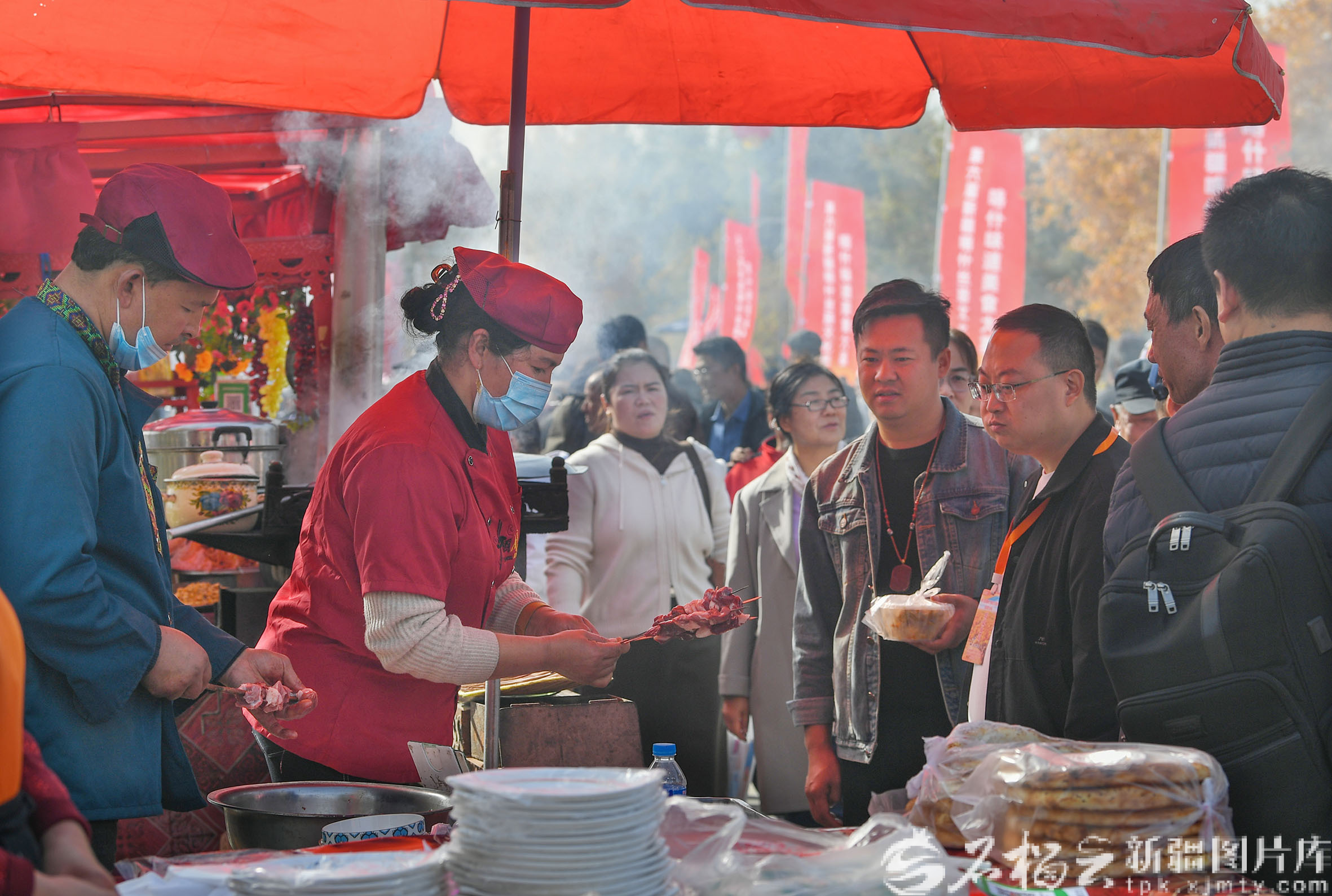 10月25日,在第六届新疆喀什丝路文化胡杨节开幕式现场,游客在美食展区品尝特色美食。