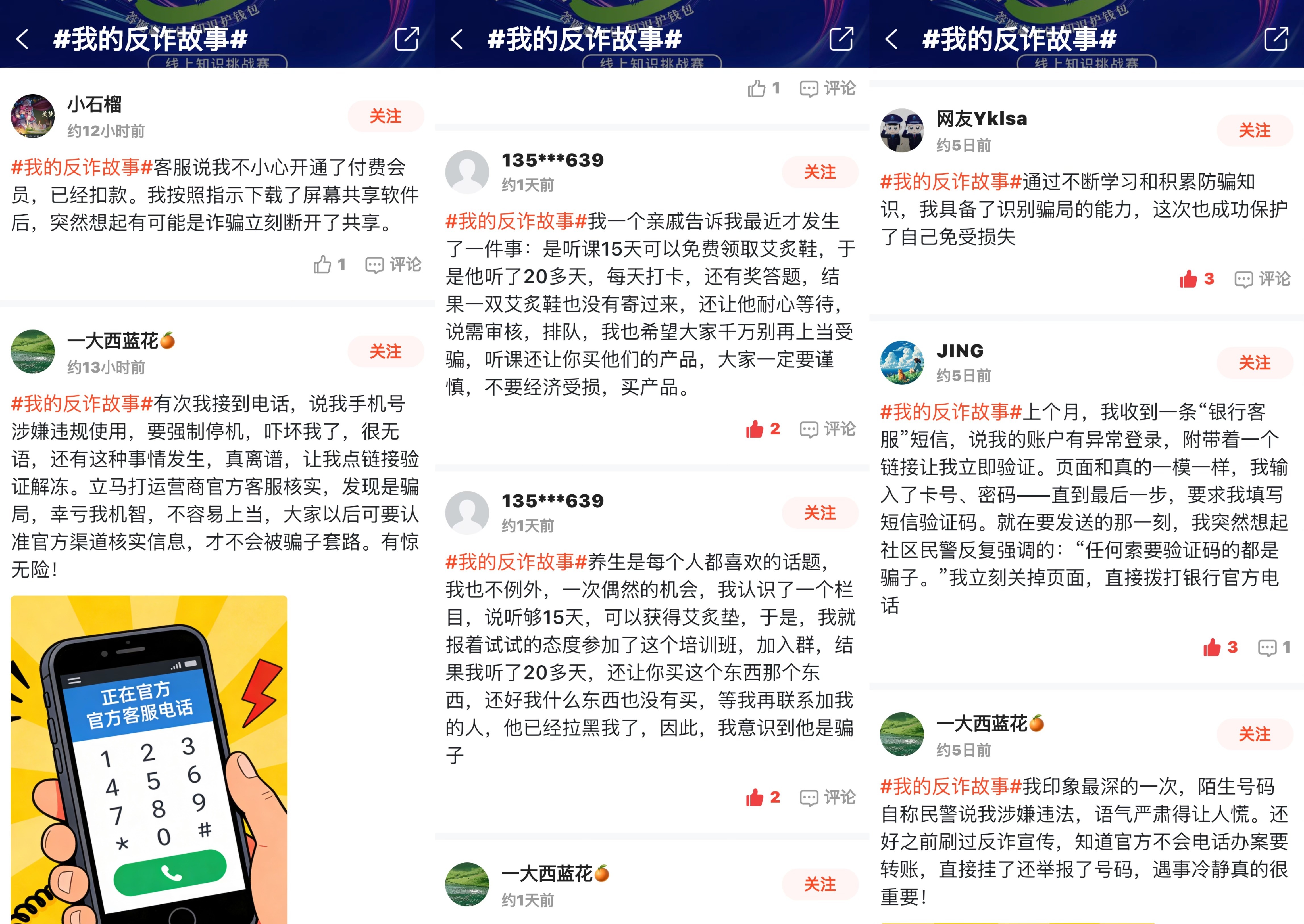 与知识挑战赛同步火热的,还有石榴圈平台的互动话题#我的反诈故事# 。这个话题下,近三十位网友分享了他们与诈骗“过招”的真实经历。这些故事,有的惊心动魄,有的发人深省,每一个故事都是一次生动的反诈教育。