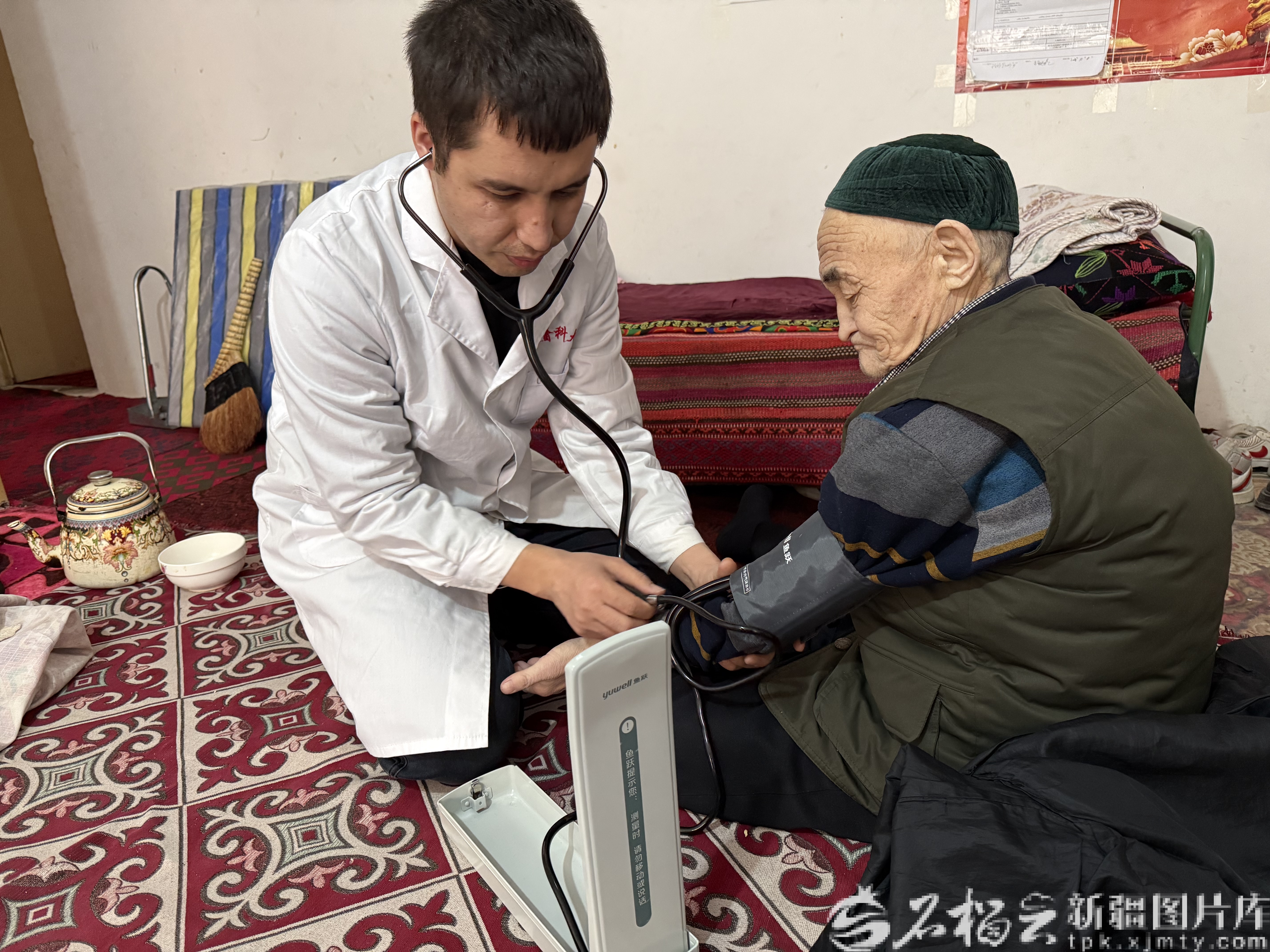 木吉乡卫生院医生努热阿迪·吾休尔上门给牧民吐尔赛克·热合曼测量血压。资料图片