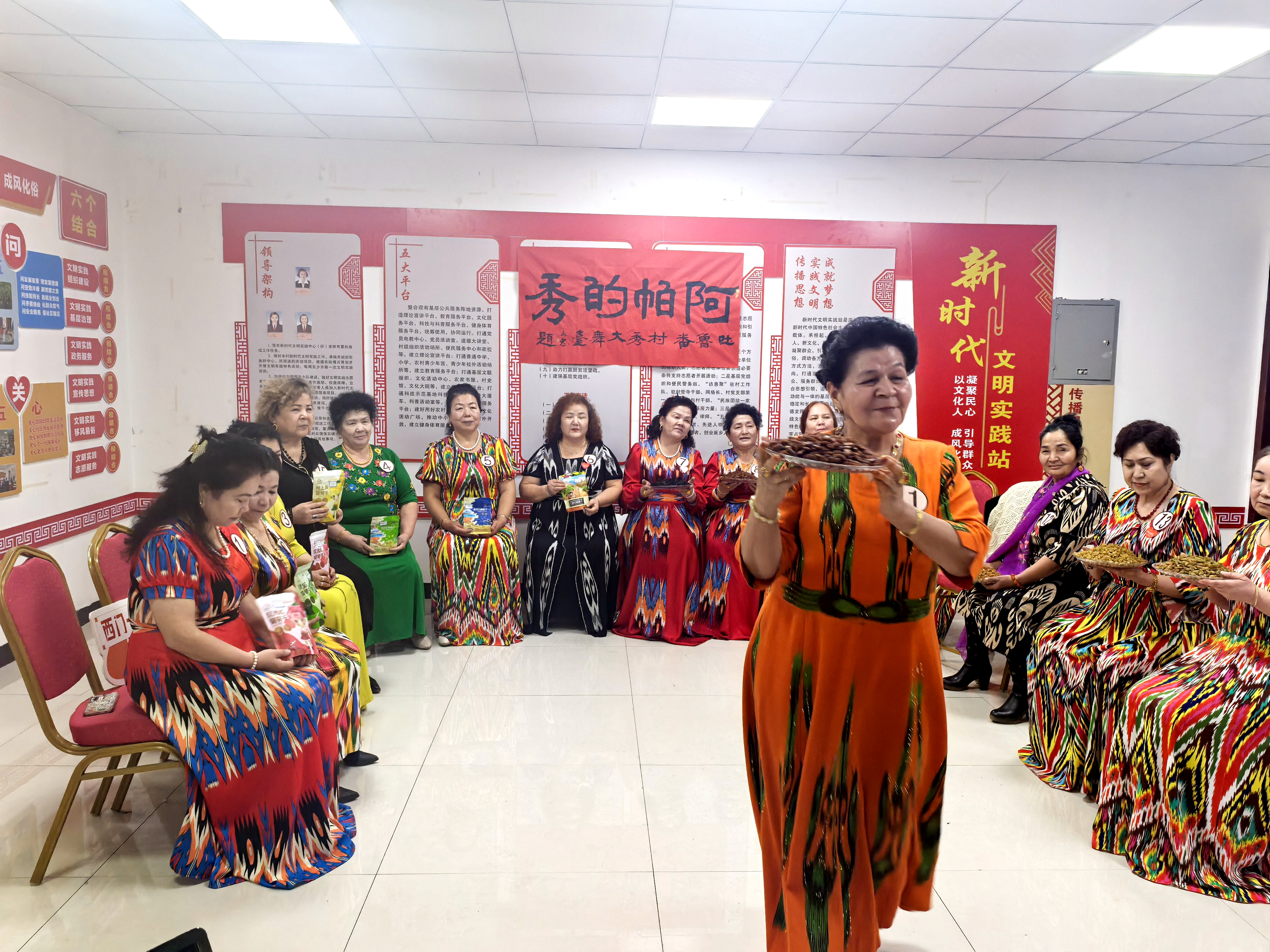 这场“秀”,秀的不只是阿帕们的风采,更秀出了村里的特色产业。阿帕们手中的干果礼盒上,不仅印有本地企业标识,更醒目标注着新城西门村的专属logo,乡土气息与品牌意识相得益彰。