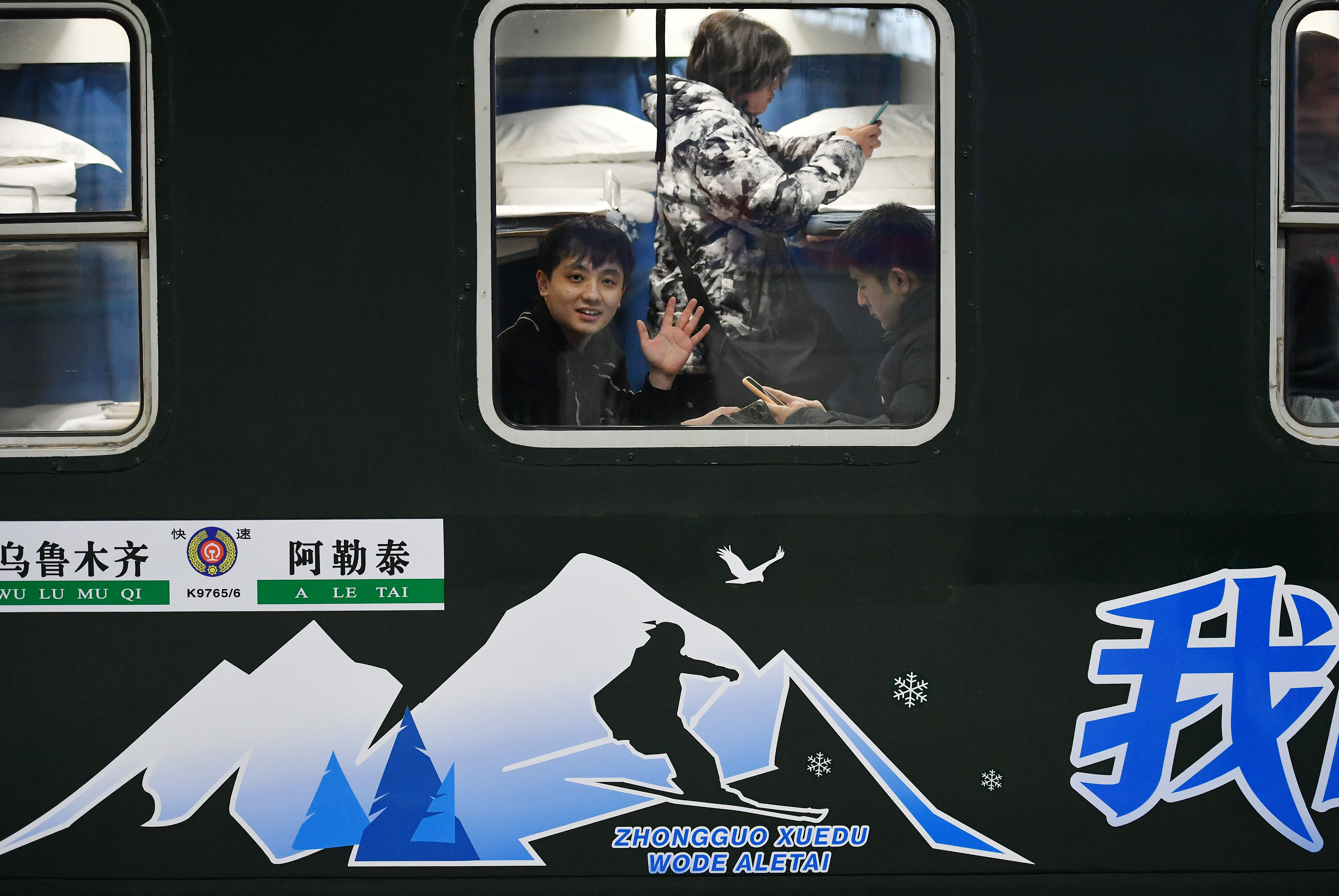 2025年12月31日晚,首趟“中国雪都·我的阿勒泰”号冰雪主题旅客列车鸣笛启程,列车缓缓驶出站台,乘客向镜头招手。石榴云/新疆日报记者 邹懿摄