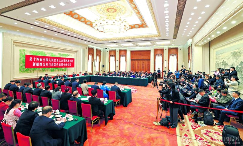 3月6日15时,出席十四届全国人大四次会议的新疆代表团在人民大会堂新闻发布厅举行全体会议,并向中外媒体开放。代表们现场回答了国内外记者的提问。