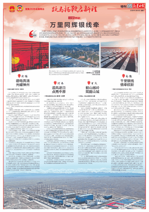 今年全国两会,新疆日报、河南日报、安徽日报、重庆日报推出“万里同辉银线牵”联动报道,讲述疆电赋能区域发展、兄弟省区市携手同兴的时代故事,展现全国统一电力市场建设中的区域协同力量。