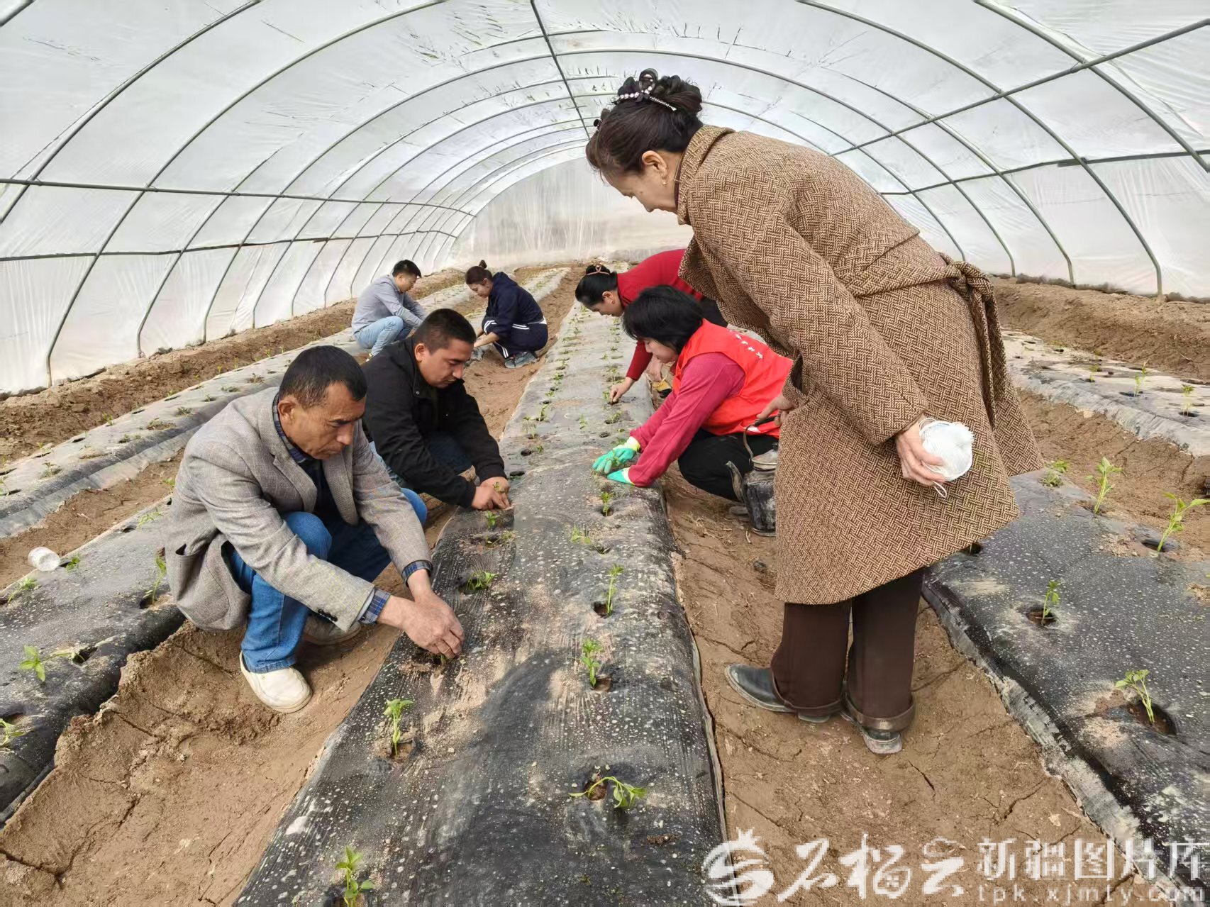 3月20日,在柯坪县玉尔其乡尤库日斯村,驻村工作队、村“两委”和群众一起栽种辣椒苗。石榴云/新疆日报记者张治立 摄