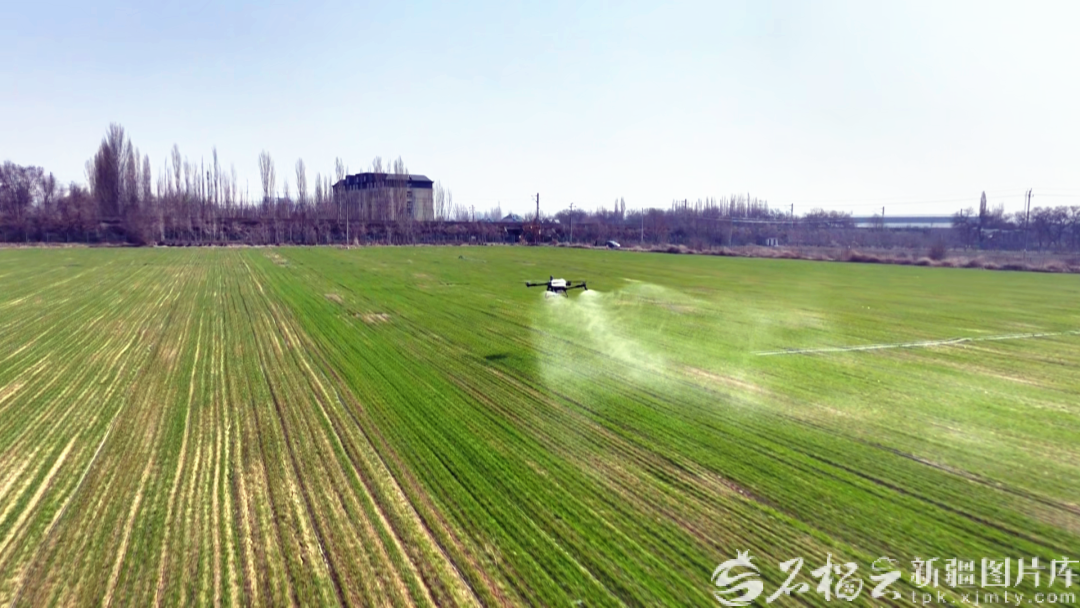 3月20日,霍城县一处冬小麦种植基地,植保无人机在开展病虫害防治作业。郝怡然摄