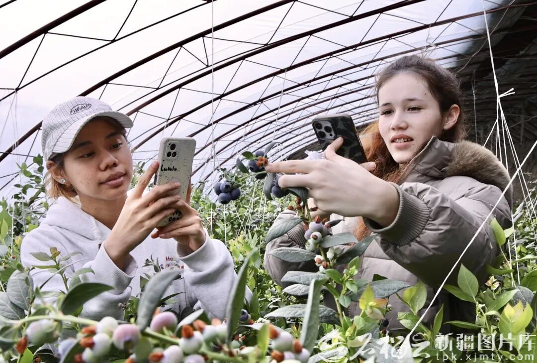 3月20日,在阜康市九运街镇的蓝莓种植基地,游客沉浸式体验采摘乐趣。张新珍摄