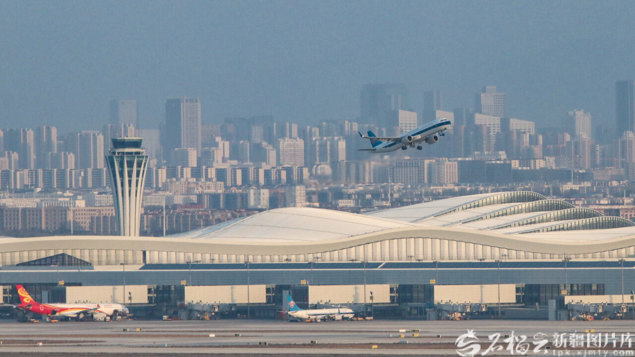 一架客机从乌鲁木齐天山国际机场启航(资料图片)。石榴云/新疆日报记者 蔡增乐摄