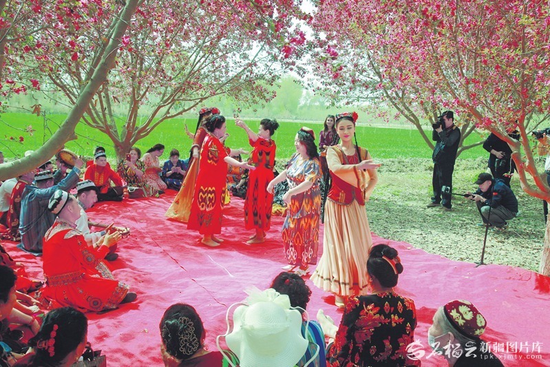 4月8日,民间艺人在阿瓦提县刀郎部落景区表演刀郎木卡姆。伴随欢快音乐,游客与艺人花间起舞,乐享美好时光。颜寿林摄