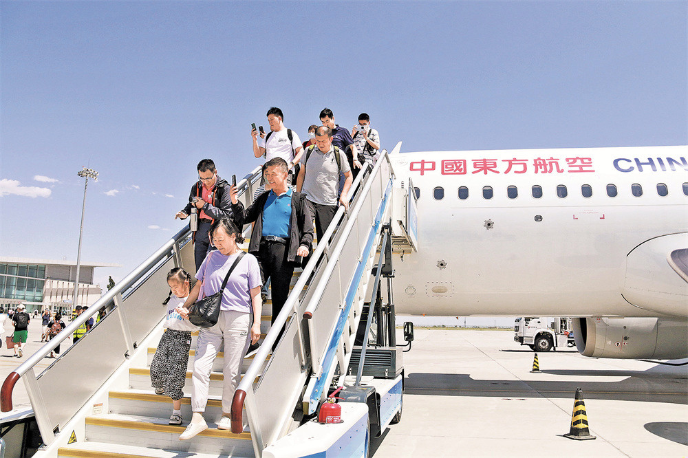 在飞机旋梯口,“热烈庆祝中国东方航空上海浦东—博乐(阿拉山口)首航圆满成功”的红色横幅格外醒目。跳起舞蹈,敬献哈达,斟满美酒,工作人员热情欢迎来自上海的客人。这让经过6个小时飞行的游客刚一踏上博州这片热土,就倍感亲切。
