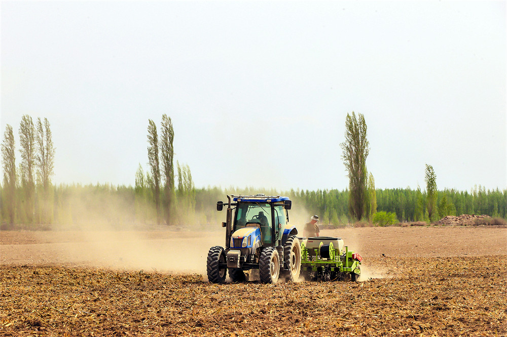24日,博乐市阿热勒托海牧场苏门迭布斯格村,实施保护性耕作模式种植的600亩玉米田里,播种机正在作业。