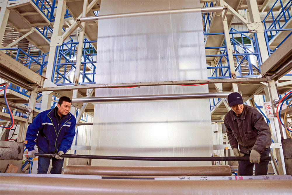 博乐市红泉质嘉塑料制品有限公司工作人员正在生产薄膜