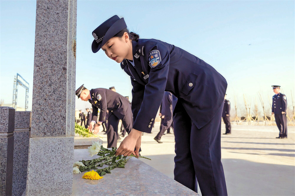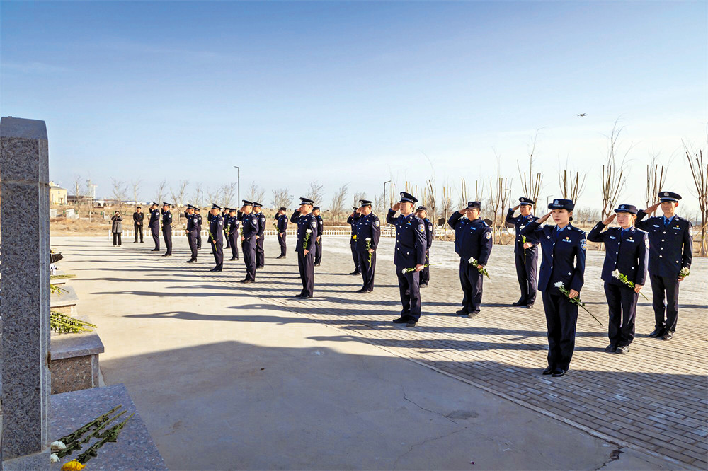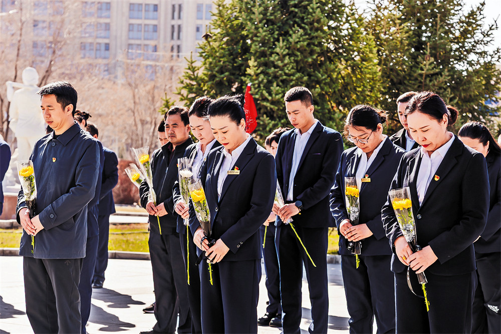 博乐烈士陵园内,松柏掩映,革命烈士纪念碑庄严肃穆。州直各单位,公安、司法系统党员干部、民警辅警整齐列队,齐唱国歌,肃立默哀。微风拂过祭扫人员坚毅的脸庞,他们手中的黄菊微微颤动。