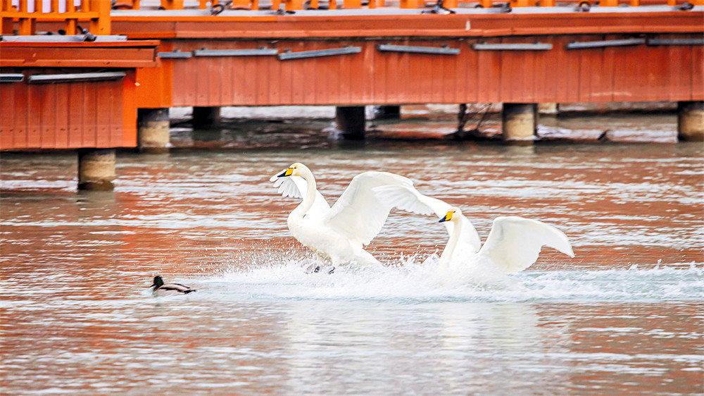 12 月 27 日,博乐市滨河公园,两只洁白的天鹅振翅掠水,羽翼掀起细碎浪花;一旁绿头鸭悠然相伴,动静之间尽显灵动。