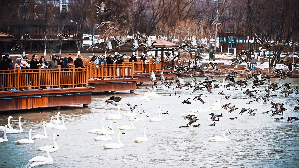 连续九年,百余只天鹅“恋”上博乐市滨河公园,在这里安然越冬、欢度新年。2月21日,正值春寒,滨河公园却热闹非凡。水面上,一群群天鹅或悠然游弋、或振翅高飞,岸边站满了观赏天鹅的市民。