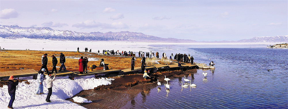3月13日,游客在新疆温泉博尔塔拉河国家湿地公园泡温泉、赏美景。连绵的雪山、金色的草地、洁白的天鹅、清澈的河水,构成了一幅天然画卷。