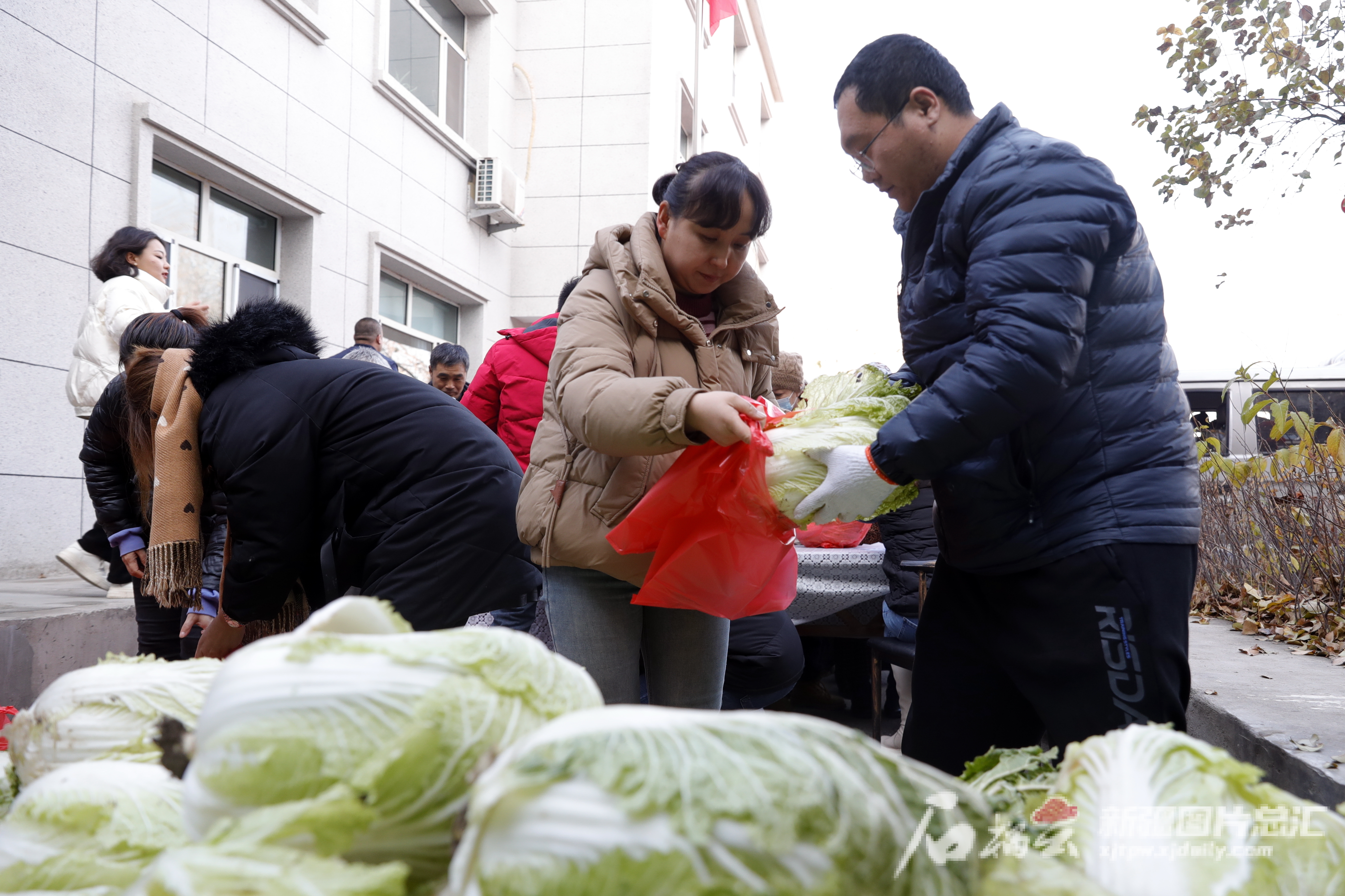 11月26日,乌鲁木齐市水磨沟区苇湖梁街道立井北社区工作人员为辖区群众分装白菜。石榴云/新疆日报记者 秦鹏摄