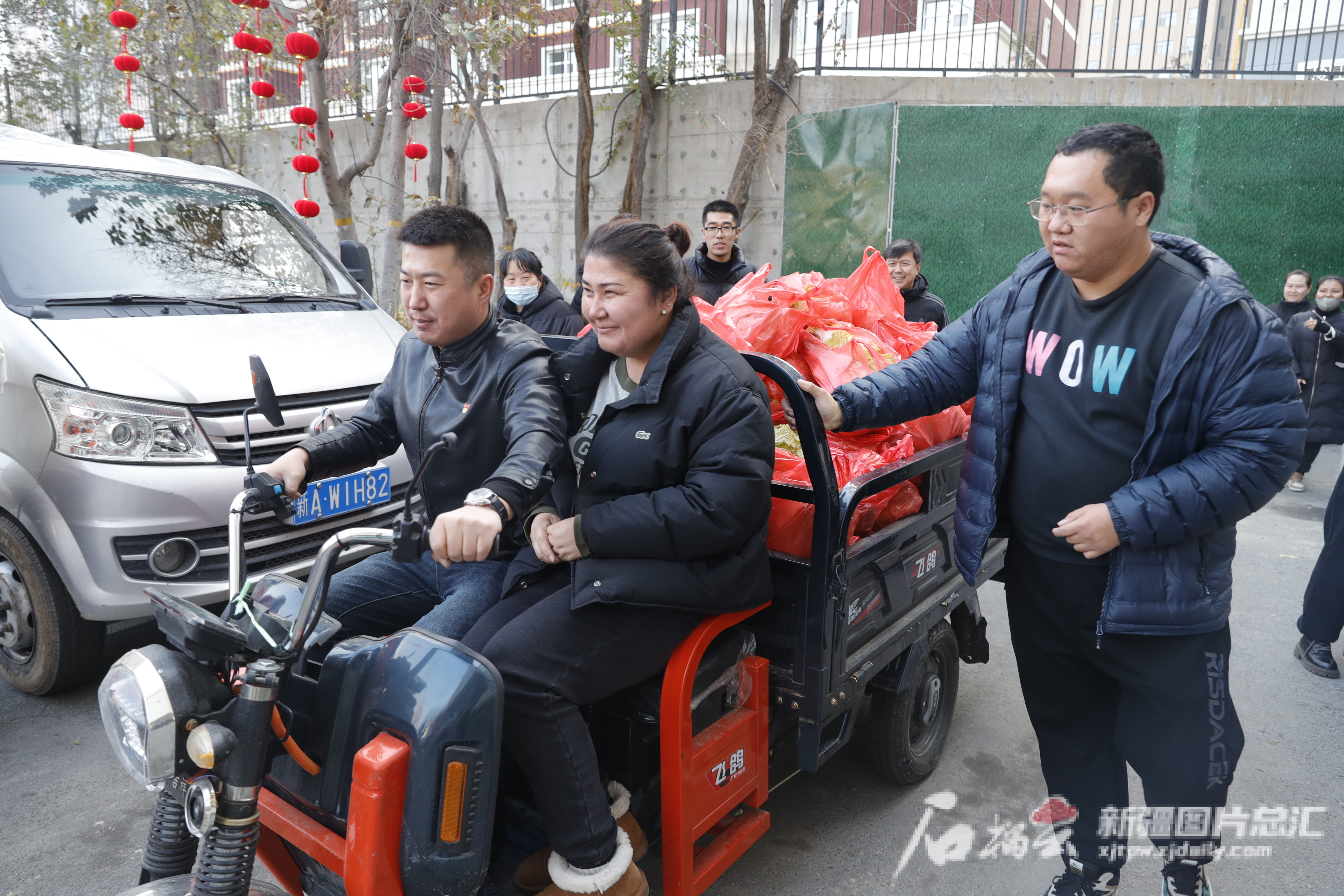 11月26日,乌鲁木齐市水磨沟区苇湖梁街道立井北社区工作人员借来三轮车,为辖区老人和行动不便的群众送菜上门。石榴云/新疆日报记者 秦鹏摄