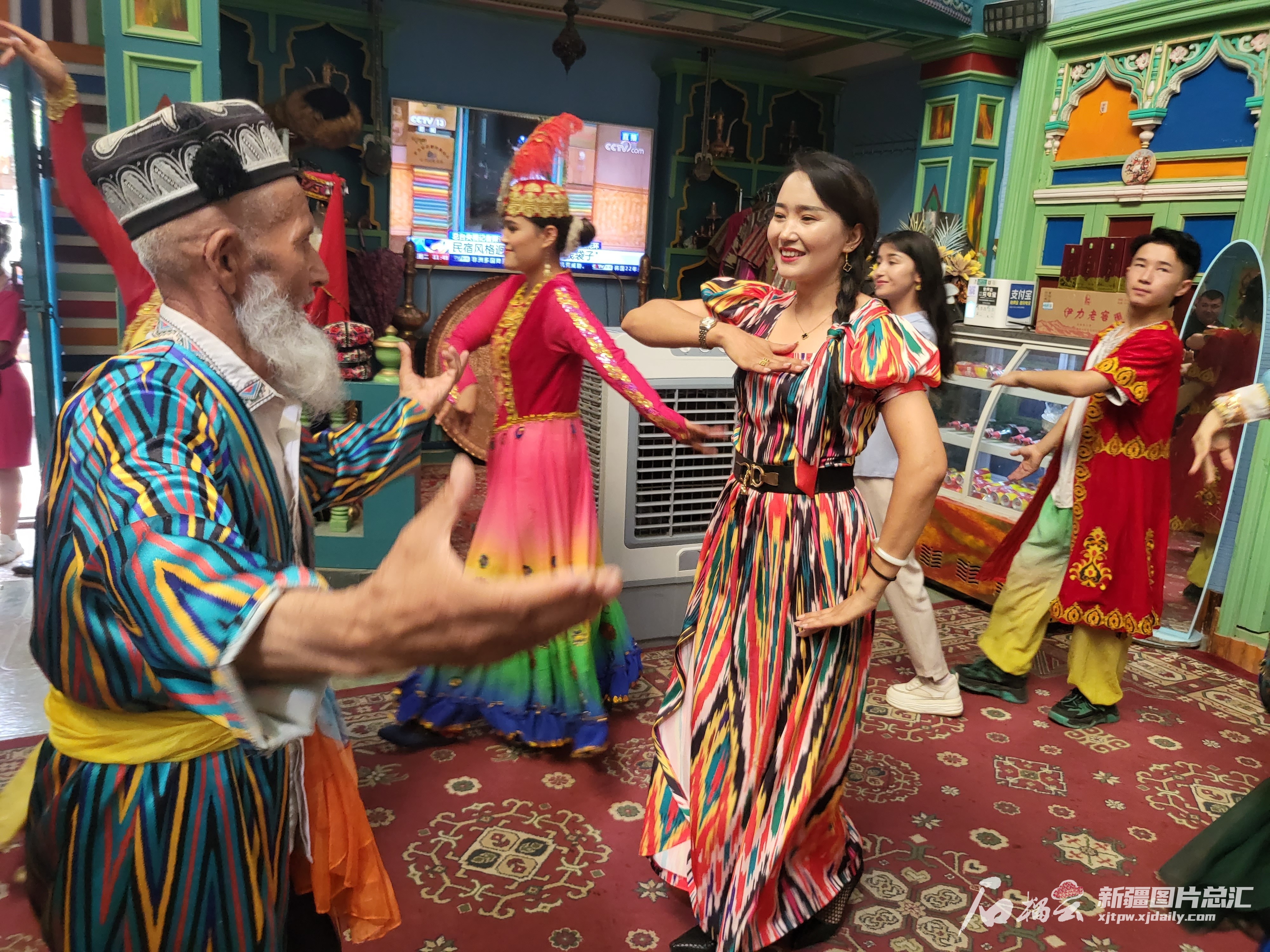 喀什古城景区网红民宿“古丽的家”,喀什网络名人、民宿负责人沙拉麦提·卡日与远道而来的客人共同跳起新疆舞。 天山网-新疆日报记者 阿比拜 摄