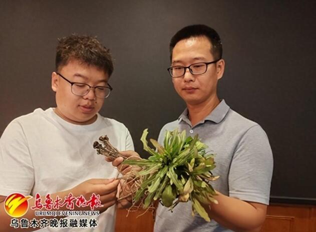 新疆农业科学院农作物品种资源研究所副研究员高强(右)与同事展示生长中的橡胶草。 记者 江斌伟摄