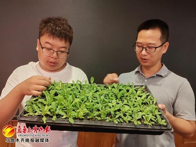 新疆农业科学院农作物品种资源研究所副研究员高强和同事展示生长中的橡胶草幼苗。记者 江斌伟摄