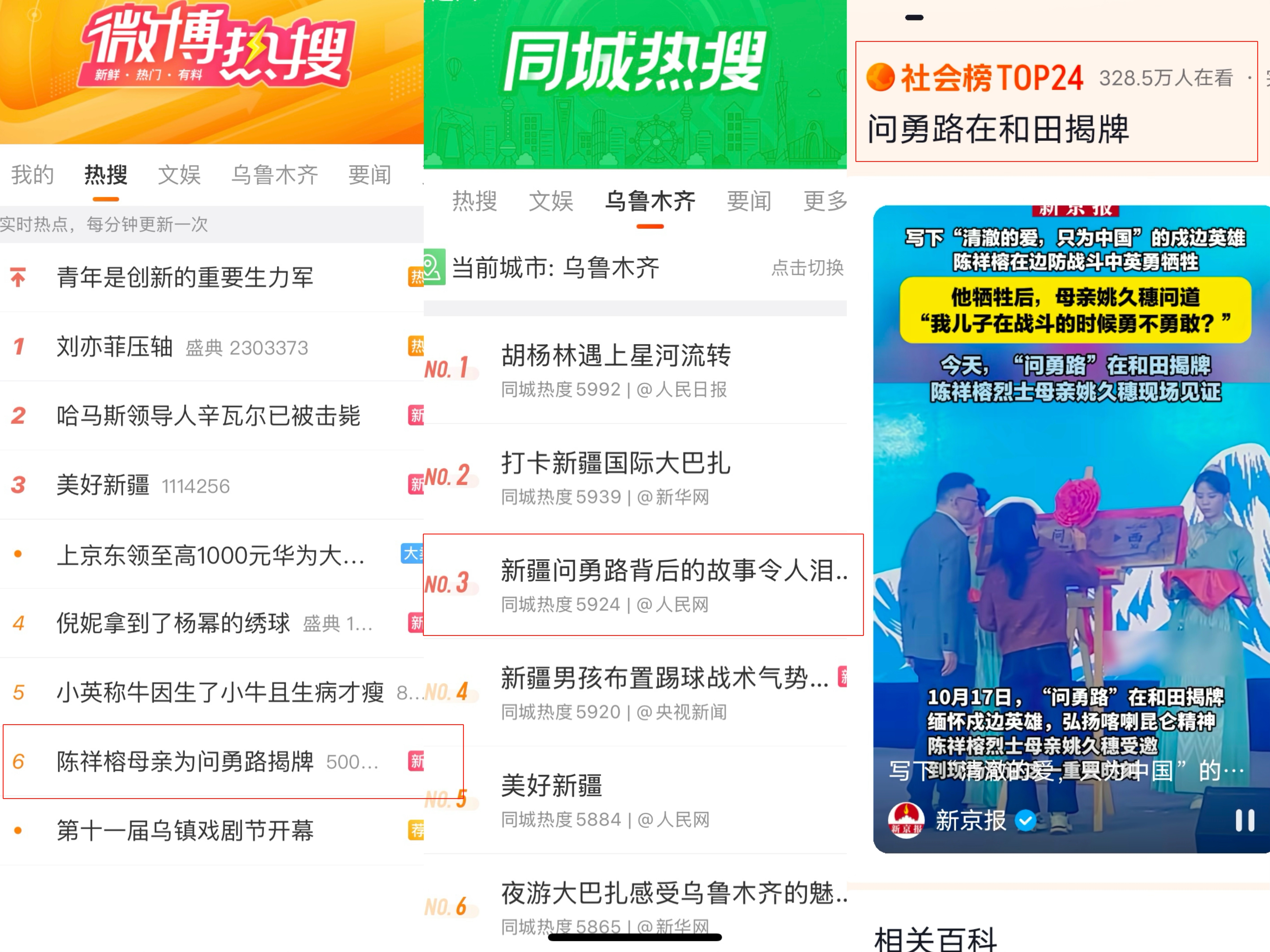 清澈的爱,只为中国。这两天,新疆日报社(集团)全媒体矩阵倾力报道烈士陈祥榕母亲姚久穗为和田“问勇路”揭牌,“问勇路”成为全网热搜。新疆日报社(集团)开设的微博话题#陈祥榕母亲为问勇路揭牌##我儿子在战斗的时候勇不勇敢#,冲上微博热搜排行榜前十名,相关报道全网总阅读量超4000万。“陈母问勇”的感人故事再次令广大网友破防。