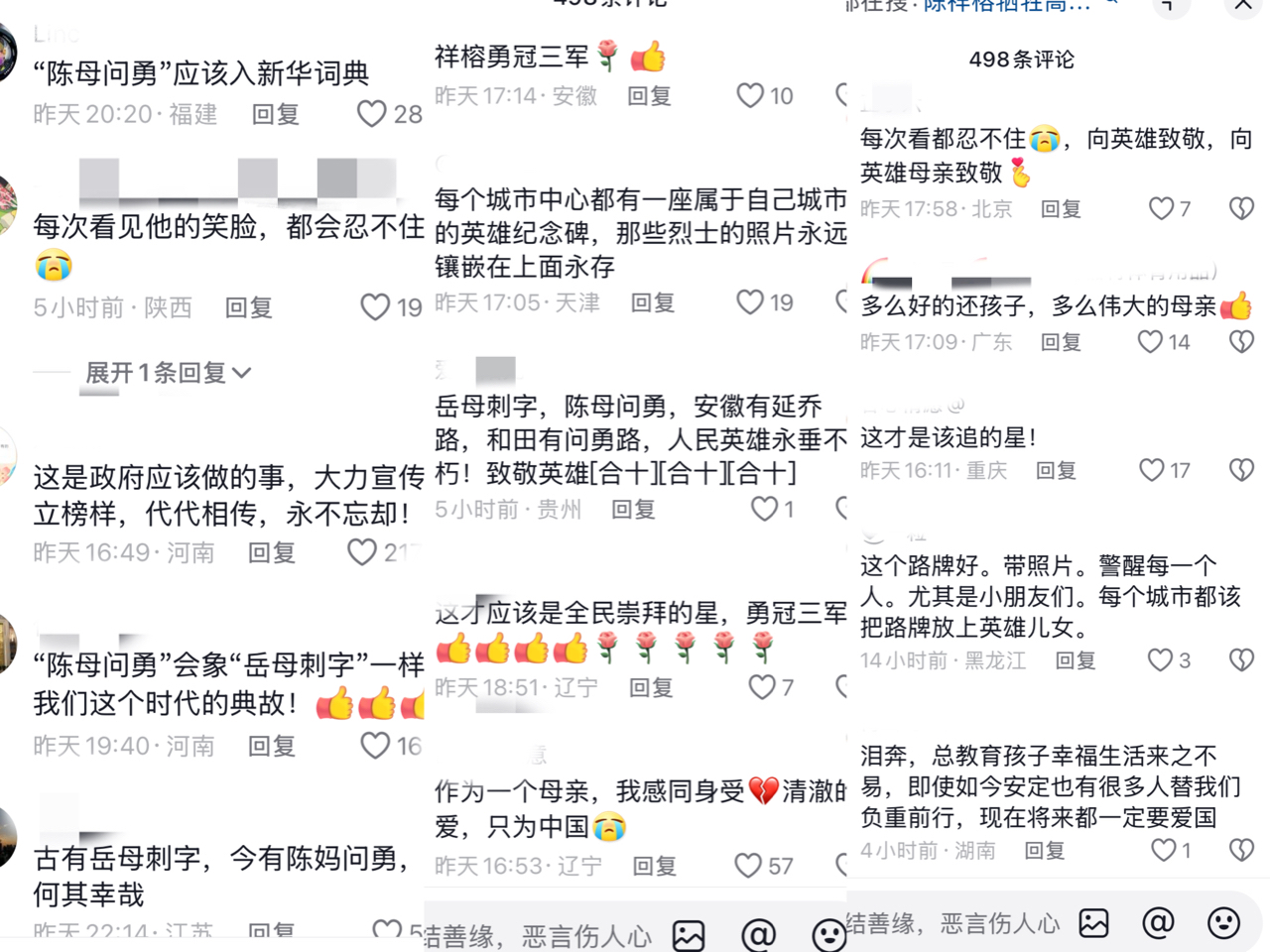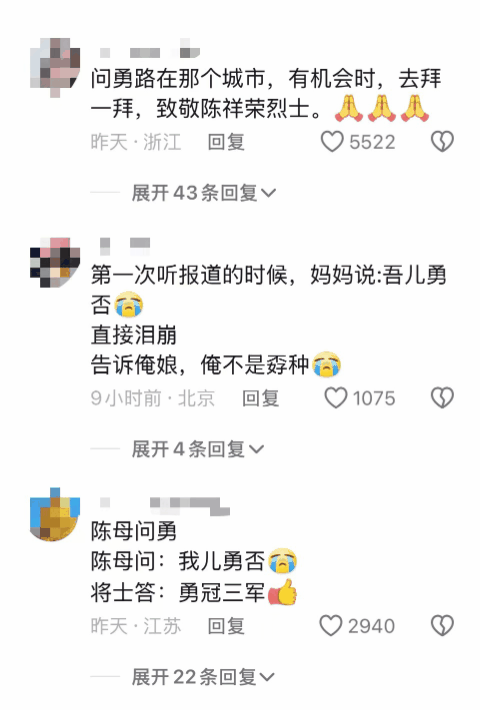 网友看到“问勇路”揭牌的报道后,瞬间想起了那句深情的告白:“清澈的爱 只为中国”,这是陈祥榕生前的战斗宣言,感动亿万国人,网友纷纷留言评论。