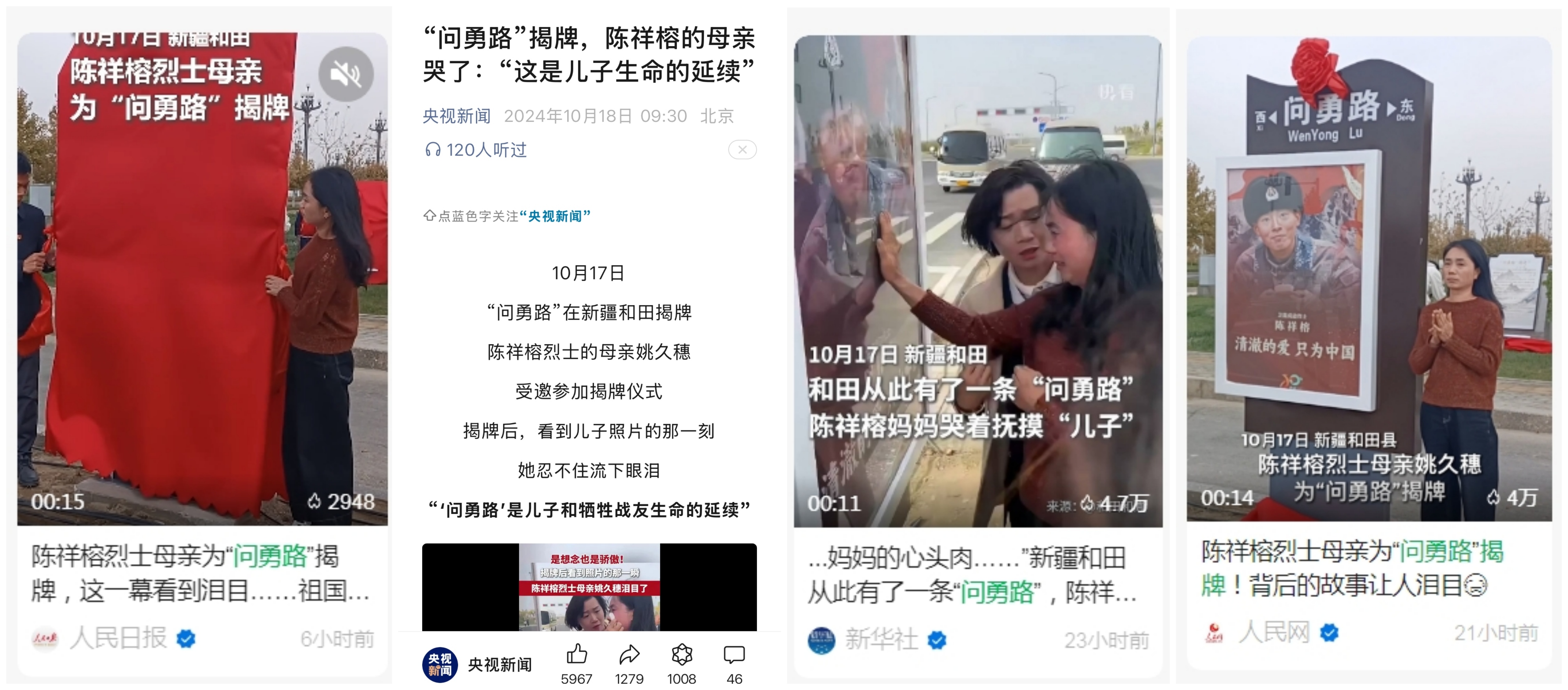 10月17日,“问勇路”在和田县揭牌,当地邀请了陈祥榕烈士母亲姚久穗参加这条新修道路命名揭牌仪式。石榴云/新疆日报率先以图文、视频的方式推出两条报道,记录下姚久穗揭牌时的感人画面,令无数网友动容。