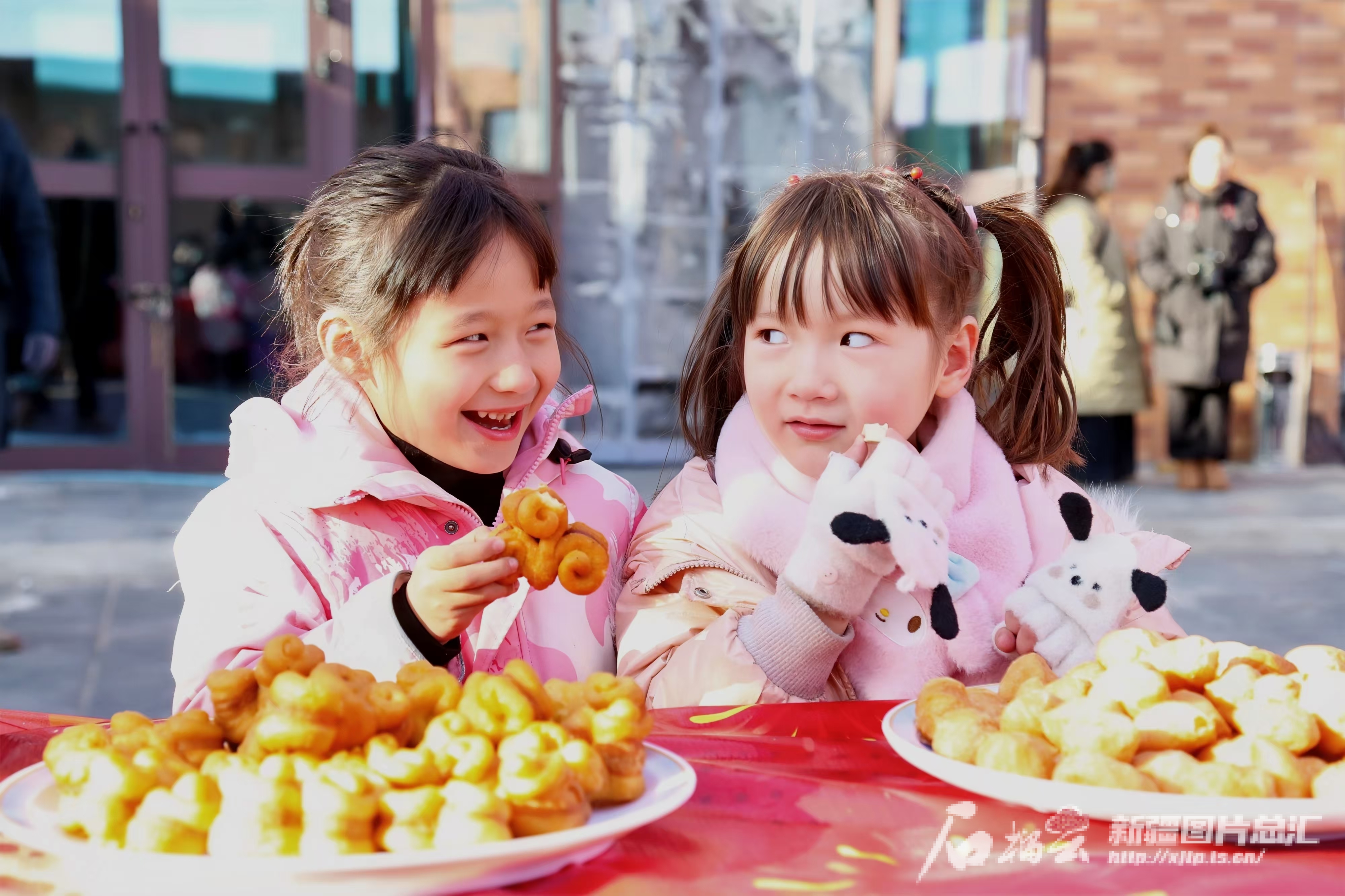 12月21日,哈密市巴里坤哈萨克自治县举办迎冬至系列民俗活动。在巴里坤县文博园,两名小女孩在高兴地品尝刚刚出锅的油馃子。石榴云/新疆日报记者 魏永贵摄