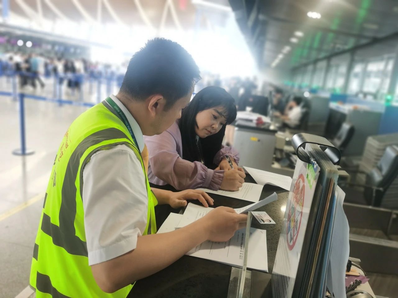 在上海浦东机场,一名旅客为同行的泰迪犬办理登机手续。图/金鹏航空微信公众号