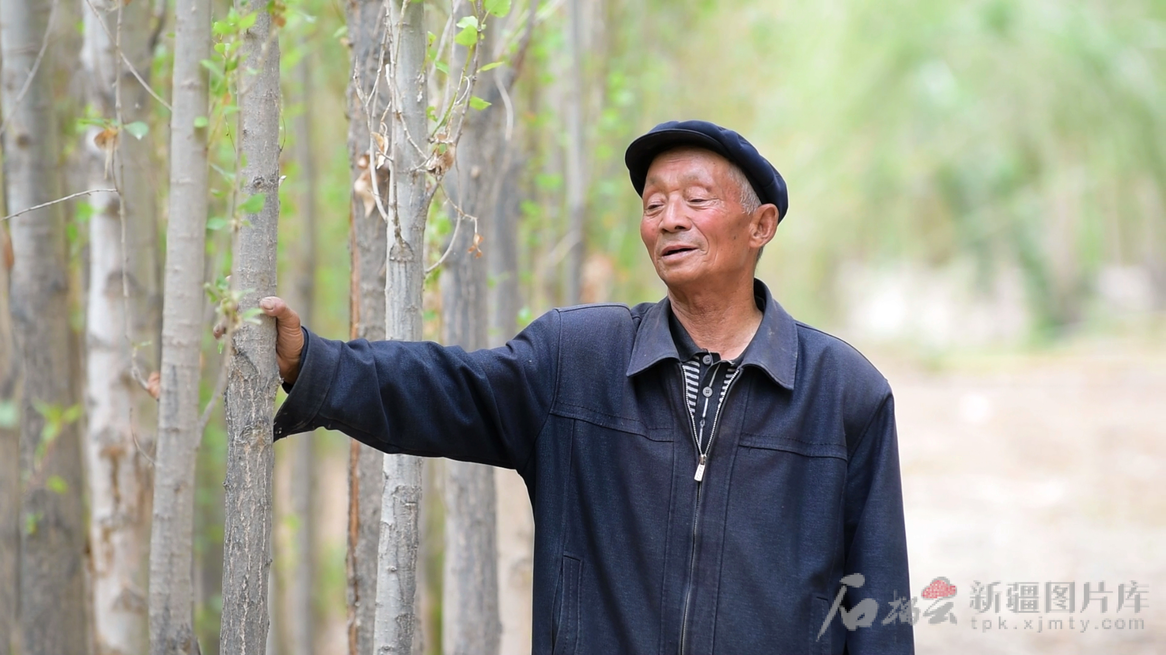 付志周抚摸自己种下的树(资料图)。和静县融媒体中心供图