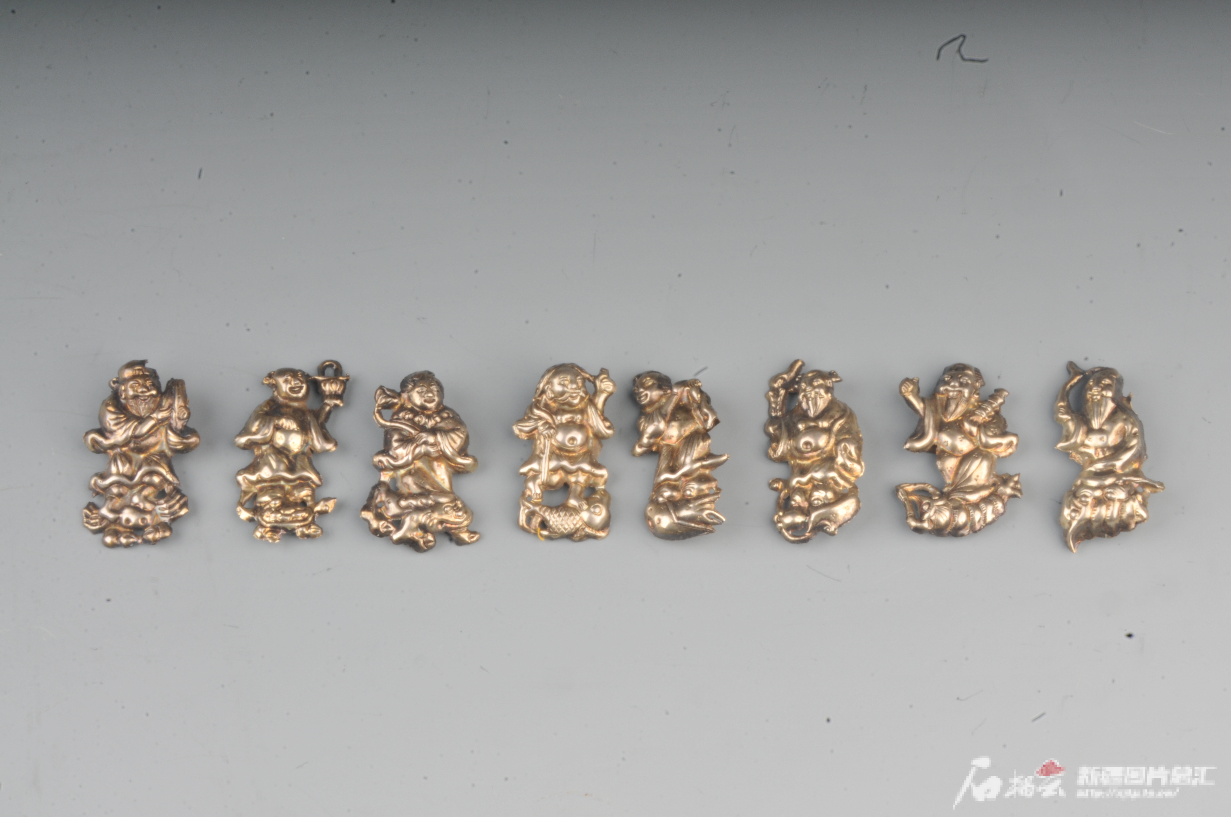 2021年,阿克苏文博院从民间征集到一组充满传奇色彩的文物——八枚仅名片大小(长4.5厘米、宽2.2厘米)的鎏金银片。这些银片虽小,却以精湛的锤揲鎏金工艺,立体刻画出八仙渡海的磅礴场景。银片后部平整的切面与中空设计表明,它们曾镶嵌在清代边疆人家的箱匣或家具上,成为日常生活中的“神话装饰”。
