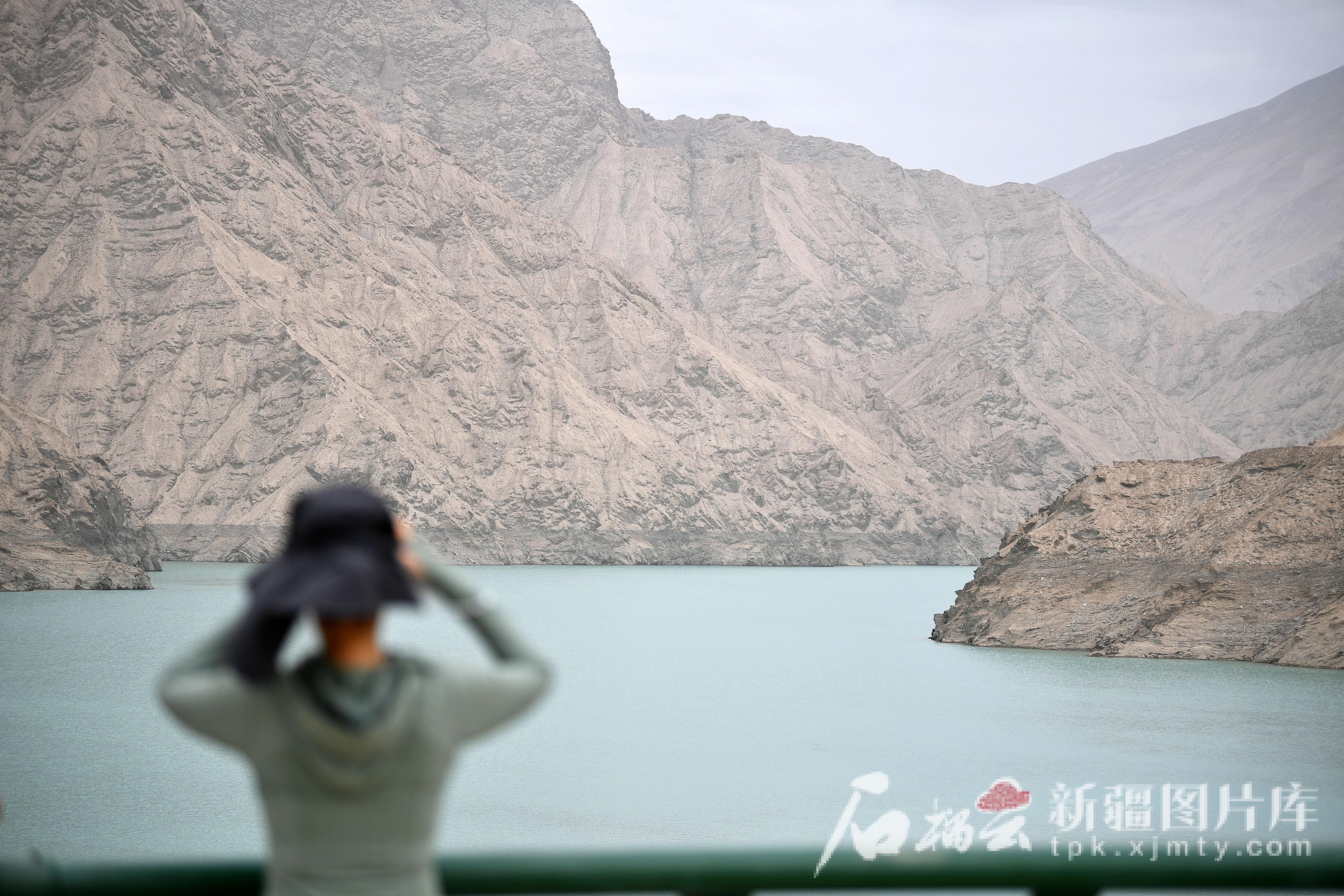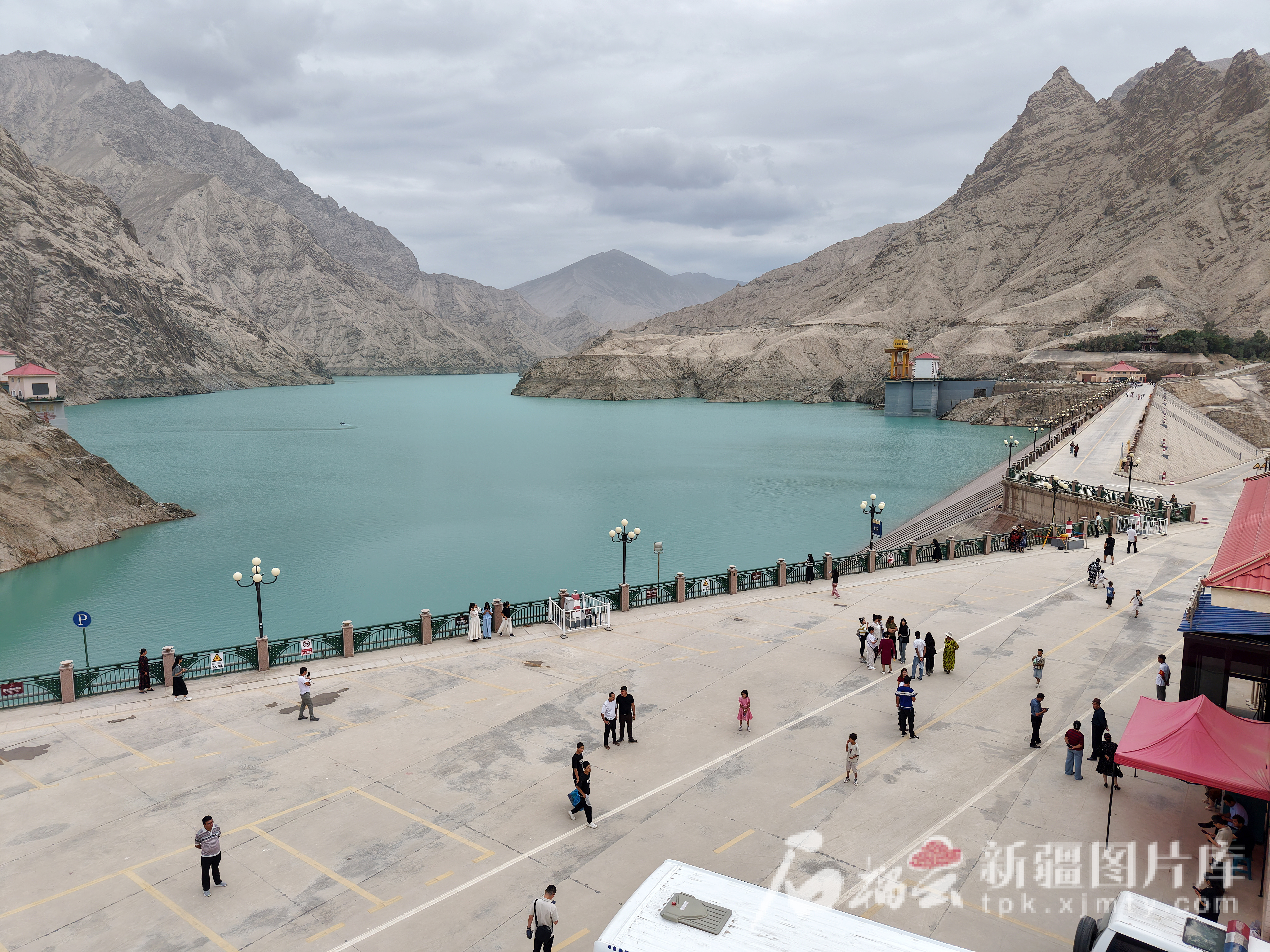 8月6日,游客在乌鲁瓦提水利枢纽工程水坝上拍摄。