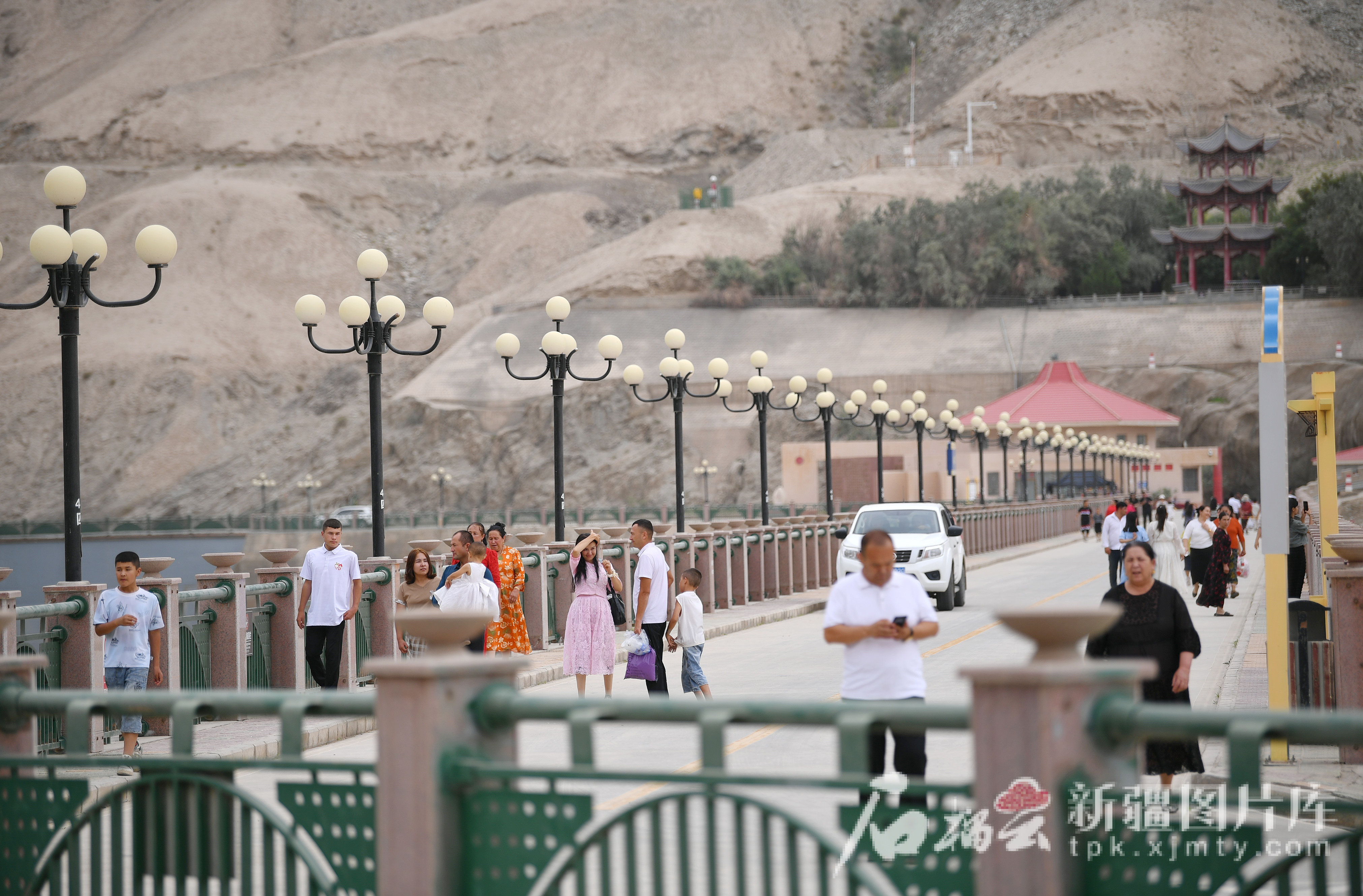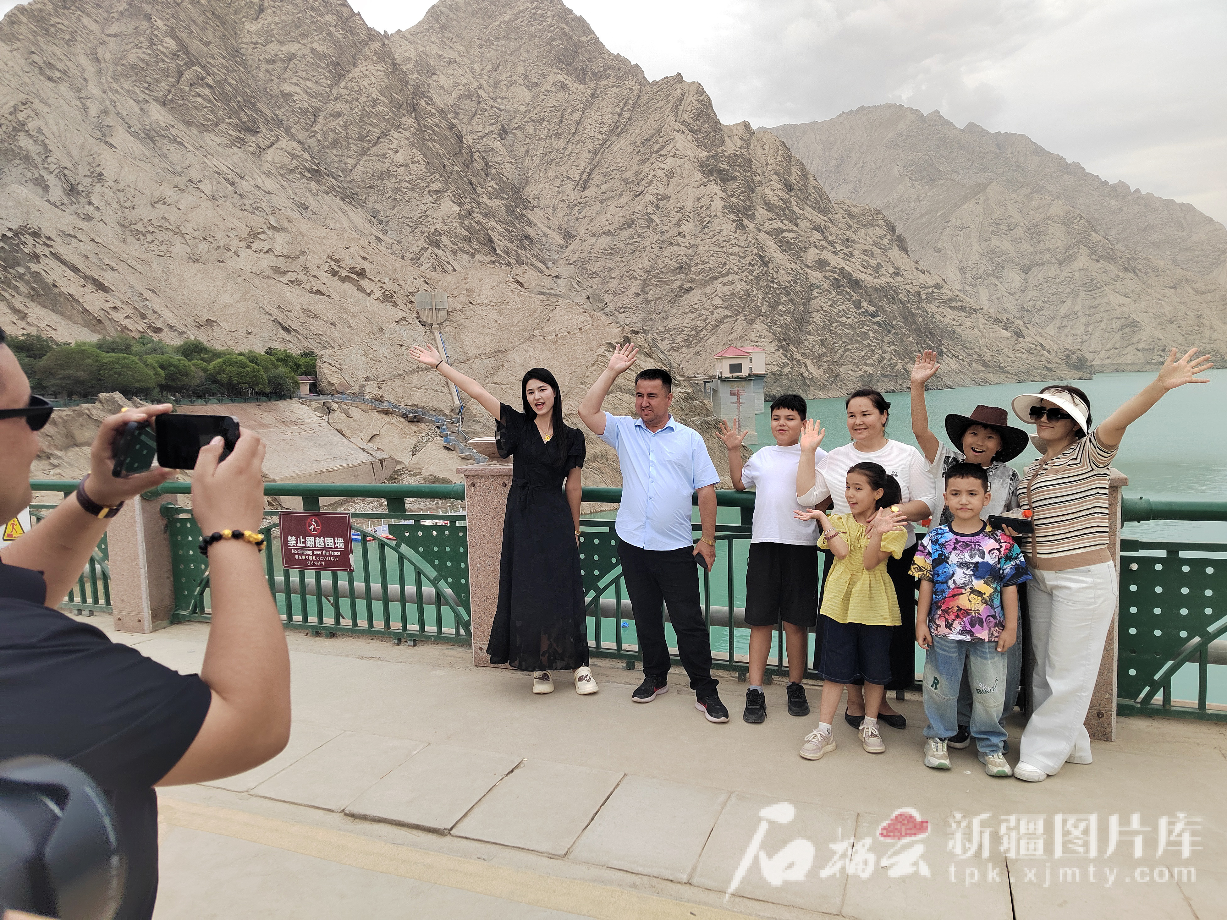 8月6日,游客在乌鲁瓦提水利枢纽工程水坝上游玩、留影。