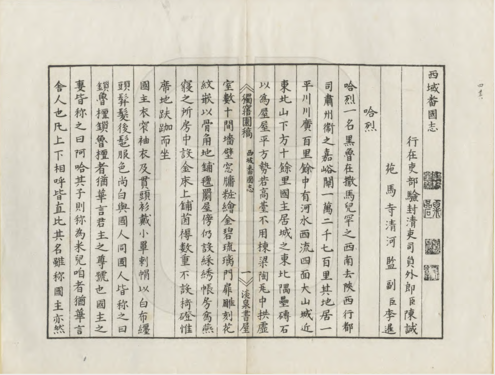 《西域番国志》与《学海类编》称《使西域记》,成书背景和时间大约与《西域行程记》同,该书分哈烈、撒马儿罕、俺都淮、八剌黑、迭里迷、沙鹿海牙、塞蓝、渴石、养夷、别失八里、于阗、土尔番、崖儿城、盐泽、火州、鲁陈、哈密、达失干、卜花儿十九目,记经济状况、各地物产、民情风俗、饮食起居、城镇分布、道里四至、山川景物、制度语言等,其编次顺序与《西域行程记》地理方位相反,即《西域行程记》取西行历程,《西域番国志》则以东归次序记录,约八千字。现通行本有据明抄本影印出版的《国立北平图书馆善本丛书》。