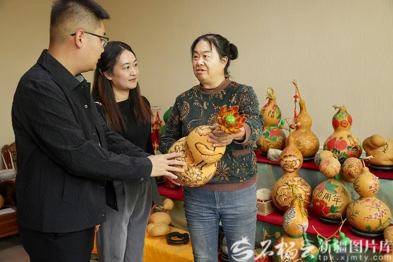 焉耆回族自治县永宁镇下岔河村乡土人才陈新萍(右)在为游客介绍她的葫芦手工艺品。焉耆回族自治县委组织部供图