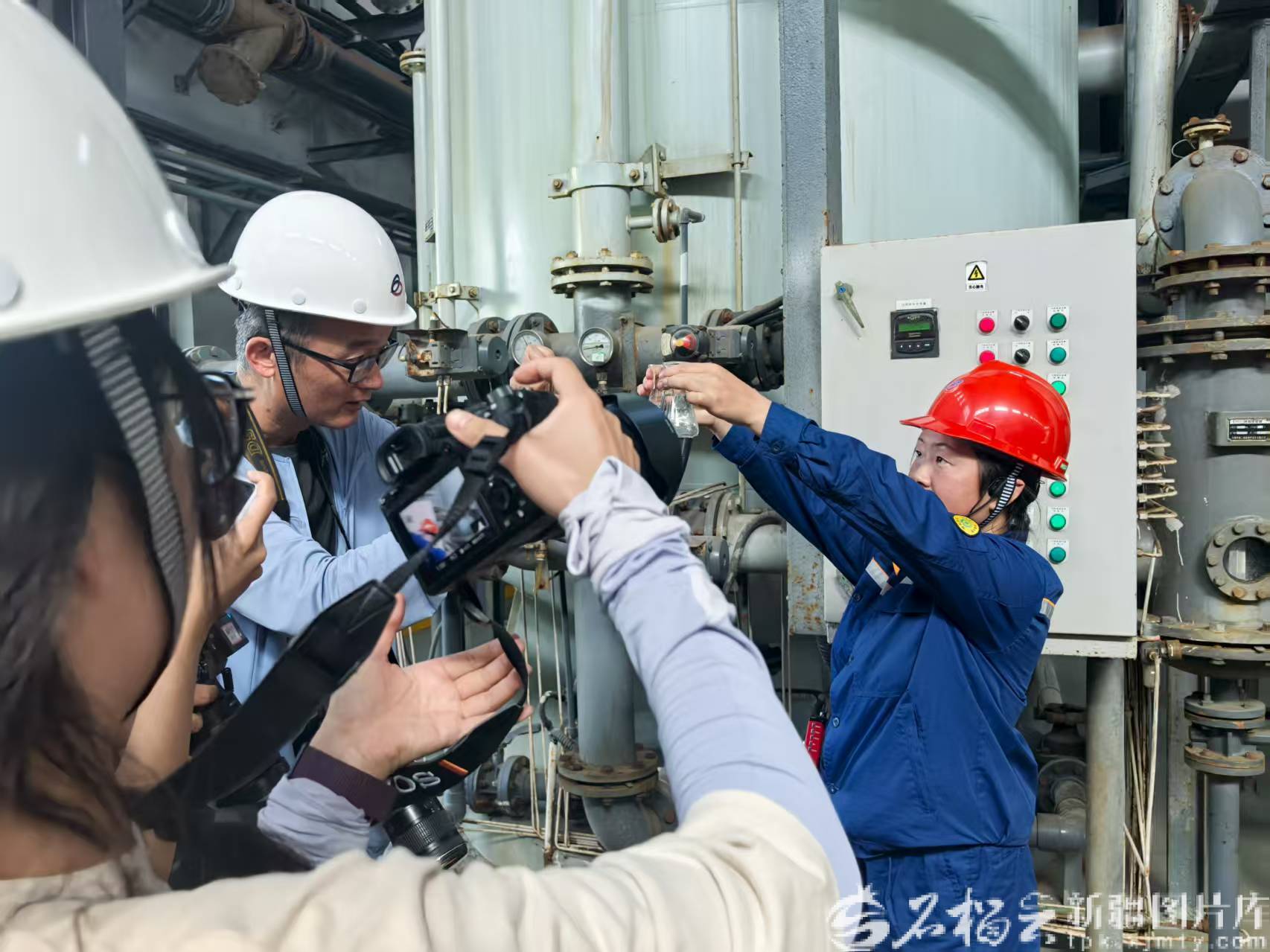 新疆八一钢铁集团有限公司互力佳源环保科技有限公司废水作业区,化验员樊晓云向采访团展示两杯处理后的再生水(资料图)。天山网-新疆日报记者 王昕摄