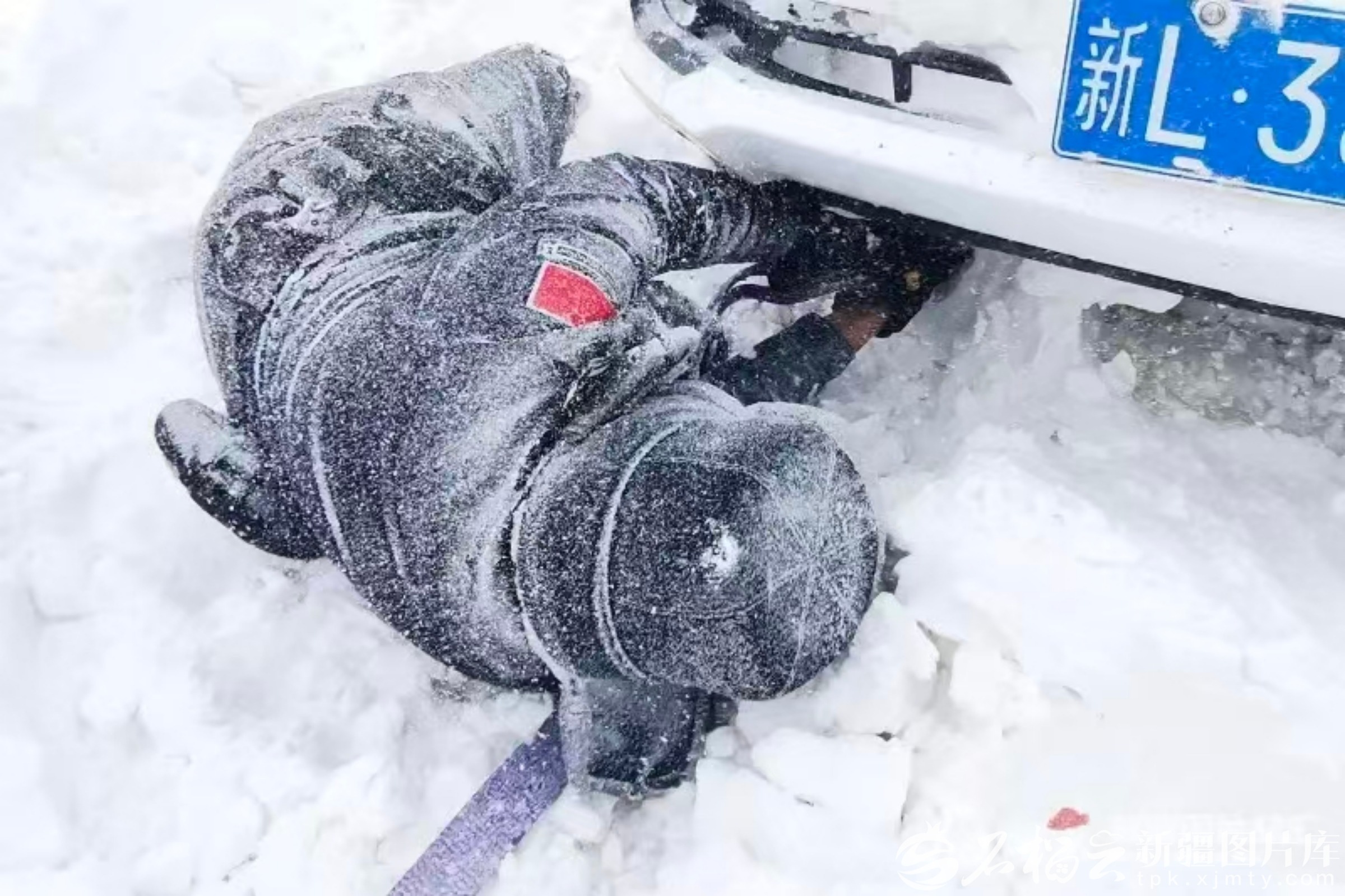 2025年3月,哈密市辖区遭遇暴雪天气,多条公路出现车辆受困险情。图为3月9日巴里坤哈萨克自治县大红柳峡乡民警救援受困牧民车辆场景(资料图)。何鹏飞摄