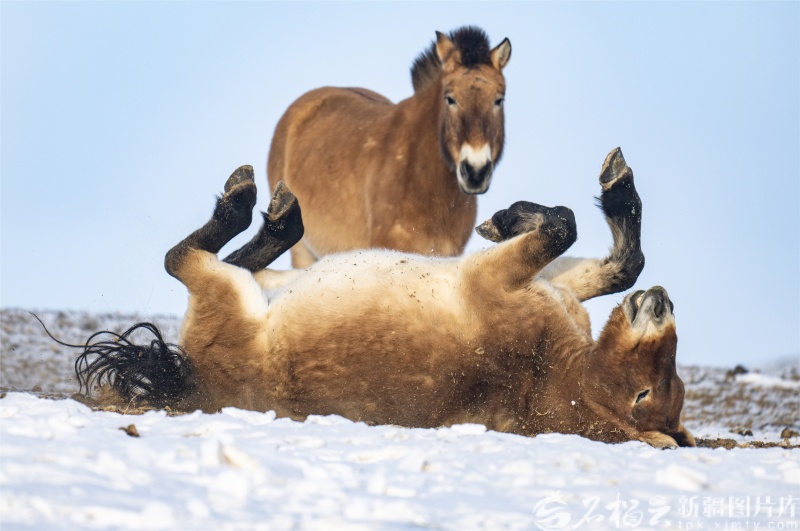 12月18日,新疆卡拉麦里山有蹄类野生动物自然保护区乔木西拜普氏野马监测站,普氏野马在雪地里打滚撒欢。何龙摄