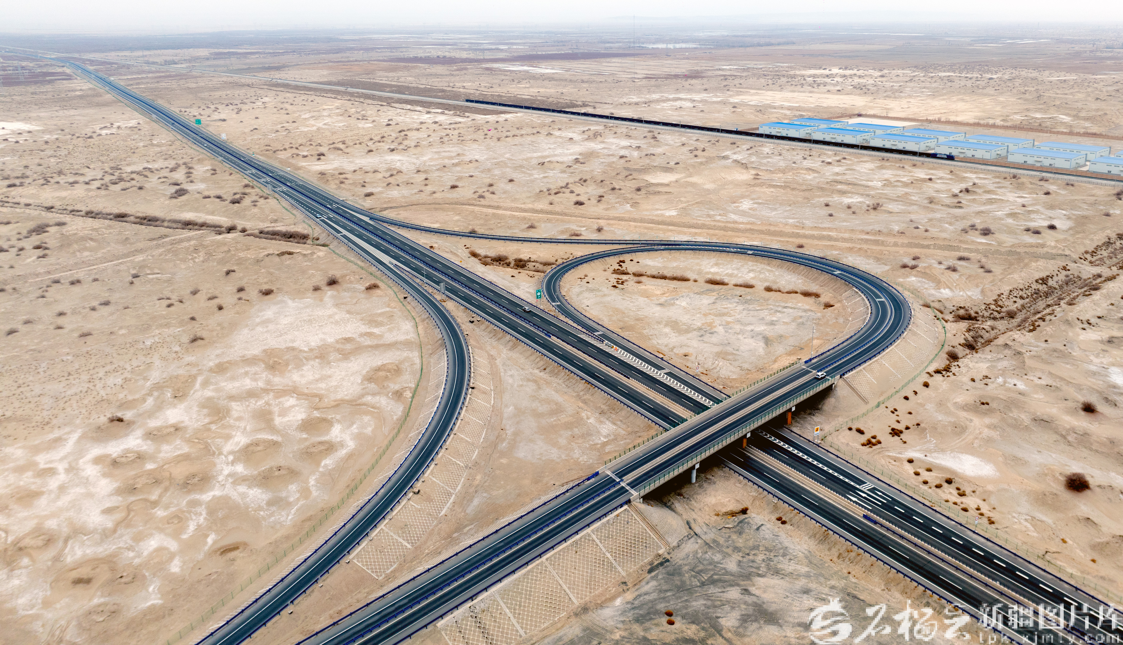 乌尉高速公路尉犁段与格库铁路相邻(12月26日无人机摄)。石榴云/新疆日报记者 韩亮摄