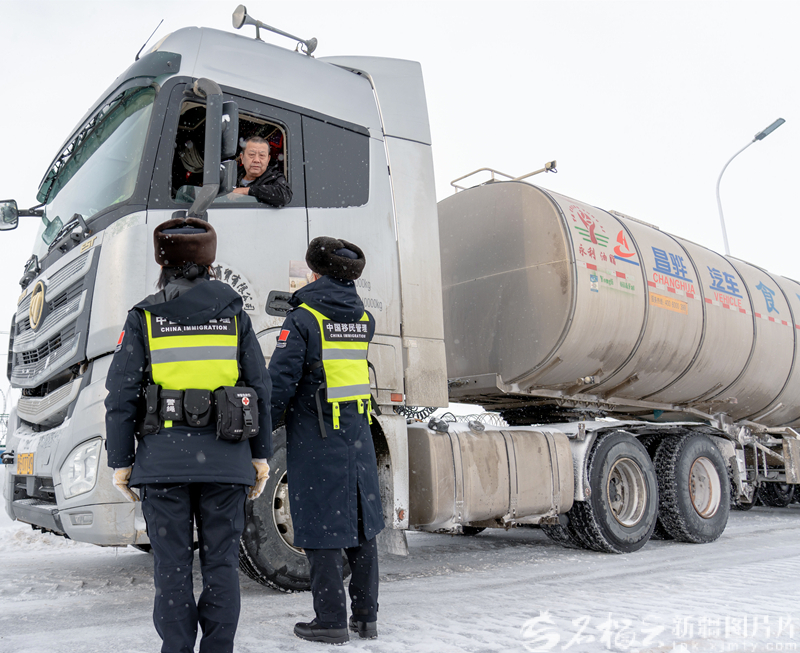 2025年12月27日,吉木乃边检站民警在核对入境司机的证件。陈亚伟 摄