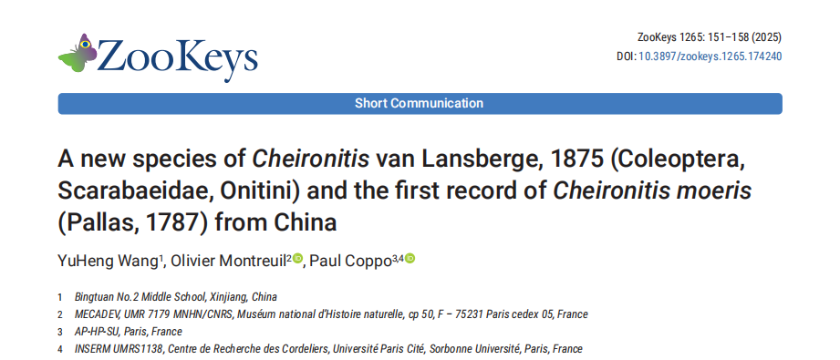 石榴云/新疆日报讯(记者 沈祖孝报道)新疆一名中学生在乌鲁木齐石人沟发现一种昆虫新物种!近日,关于这项发现的论文在国际知名生物分类学期刊《ZooKeys》上发表,该论文证实了一个手蜣螂属(Cheironitis)的新物种“嫒玮手蜣螂”,并首次记录了莫氏手蜣螂(Cheironitis moeris)在中国的分布,为全球昆虫地理分布研究补充了重要数据。