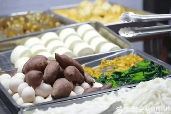 新疆工程学院推出的“励志一元餐”包括鸡蛋、红薯、小菜、玉米粥等。图/新疆工程学院提供
