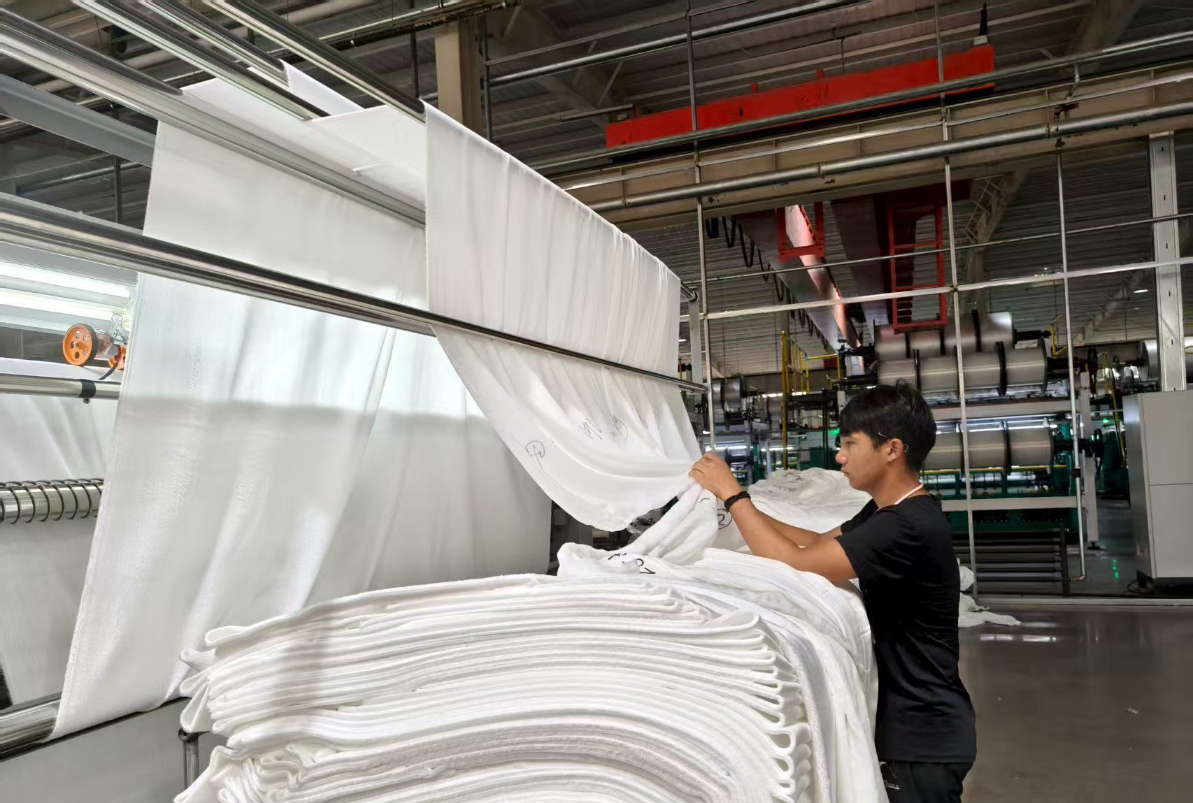 浙苏石化家纺科技(阿克苏)有限公司生产车间,员工在查看纺布质量(资料图片)。石榴云/新疆日报记者 张治立摄