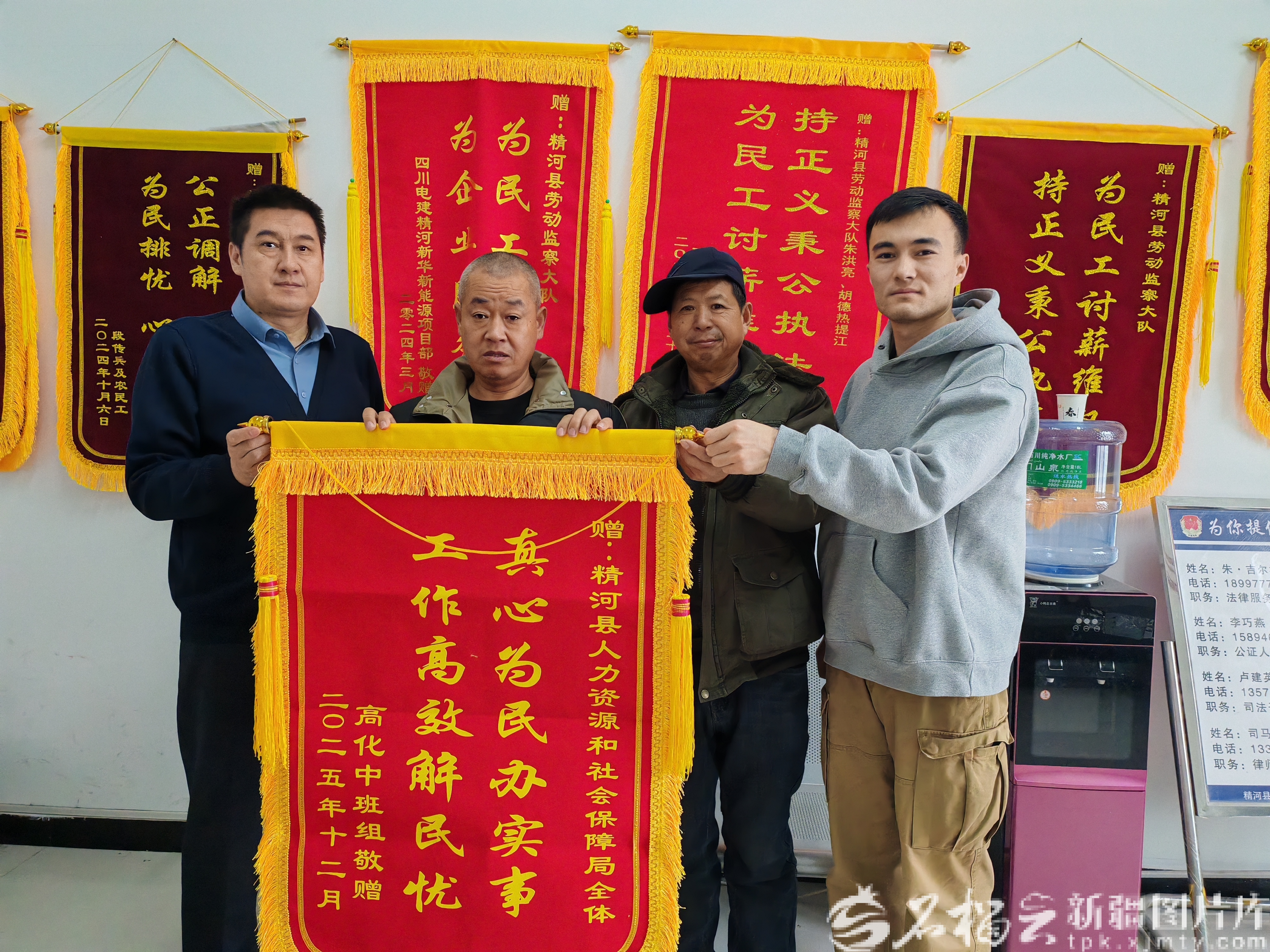 2025年12月30日,外来务工人员高化中(左二)和工友将一面锦旗送到精河县人力资源和社会保障局工作人员手中。 张伟 摄