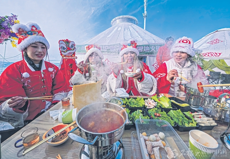 游客在昌吉市努尔加国际滑雪场品尝火锅(2025年12月20日摄)。陶维明摄