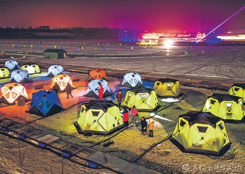 1月11日,夜幕下的克拉玛依市金龙湖冰上乐园,游客在露营帐篷里吃火锅、观星空,感受“冰天雪地暖意浓”的独特氛围。闵勇摄